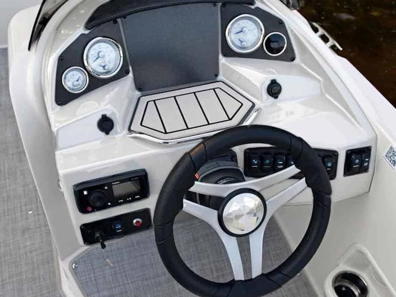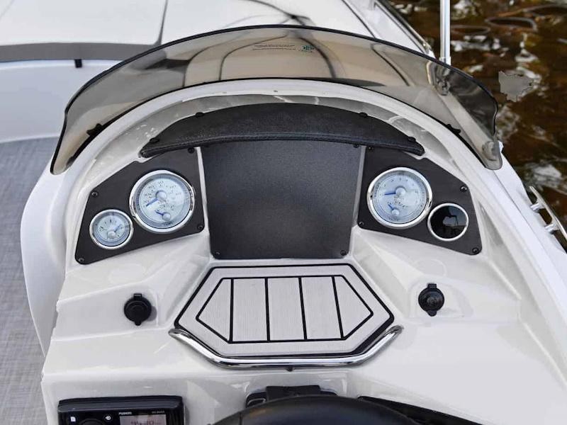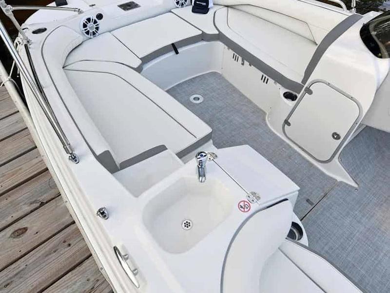 This specific model is equipped with premium upgrades, making every outing a pleasure. The immaculate white on white exterior paired with sleek black accents gives the boat a sophisticated and sporty look. Below are some of the standout features that enhance your boating experience: