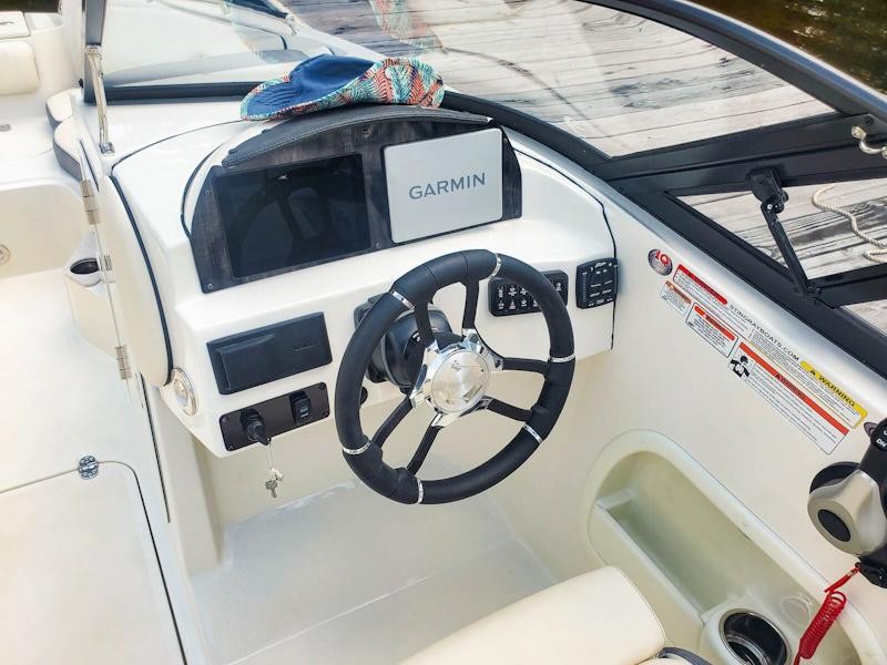 The full package includes a MERCURY 200XL Pro XS outboard motor, aluminum tandem axle trailer, and all standard options such as the Bimini top, Fusion stereo system, Garmin GPS navigation, dual battery switch, and storage cover. The MSRP for this equipped model is $108,432.35; however, Germaine Marine’s current boat show special offers it at just $85 000—taxes, documentation, and registration separate.