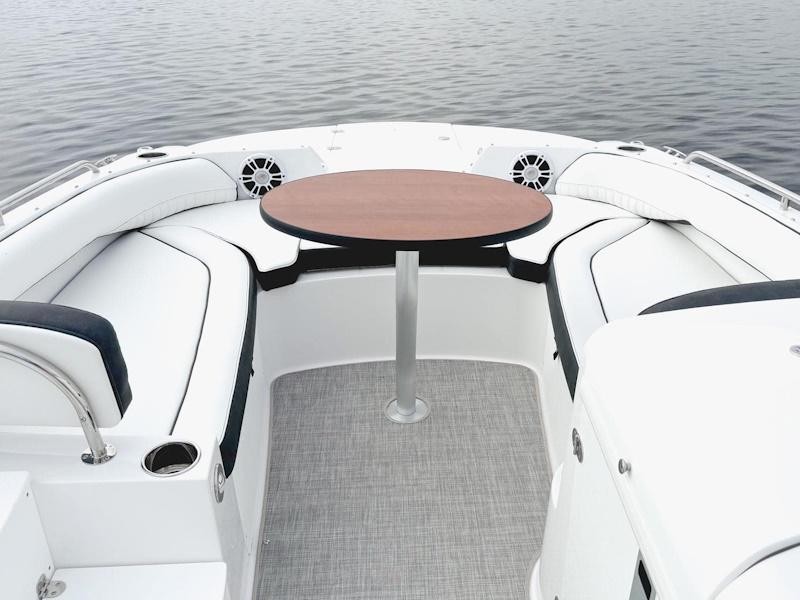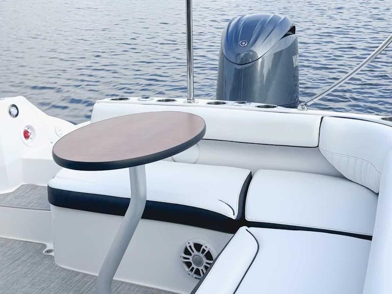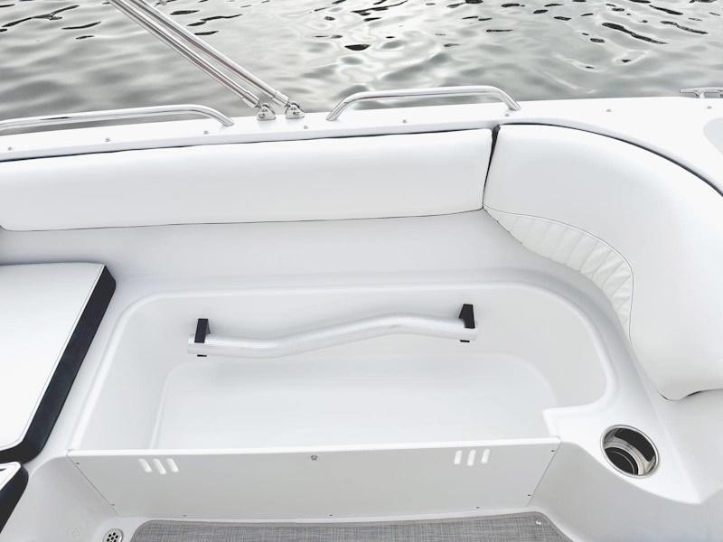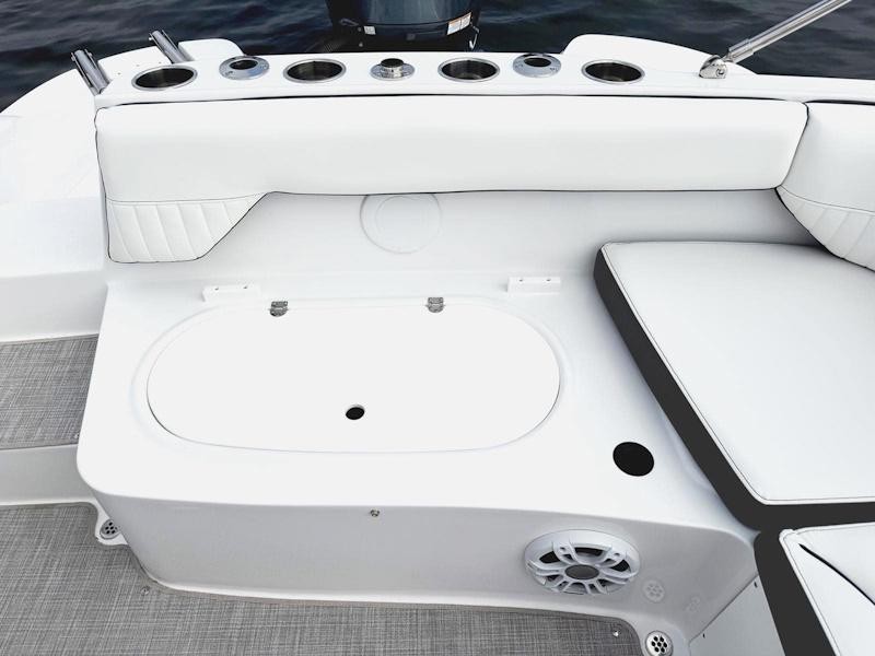 The 212SC’s open floor plan maximizes usable space. Hidden storage under the seats, inside side steps, and beneath the cockpit floor keeps gear organized while leaving room for guests to relax or play games on the deck table.