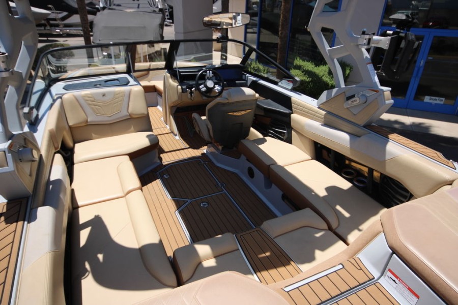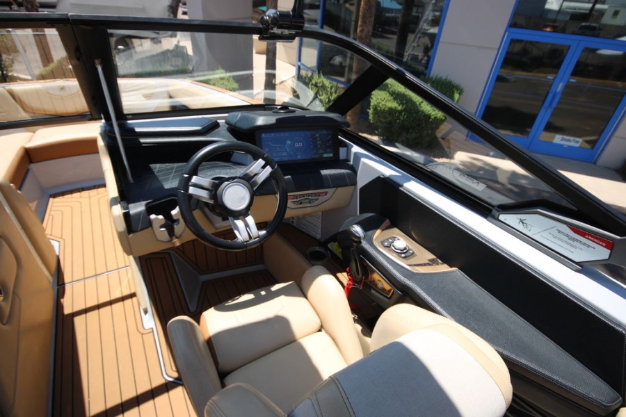 The layout of the Nautique Super Air G23 was meticulously planned to keep everything within easy reach while maximizing visibility across all water activities. The driver benefits from an advanced, asymmetrical design that incorporates a LINC Panorama touchscreen display.