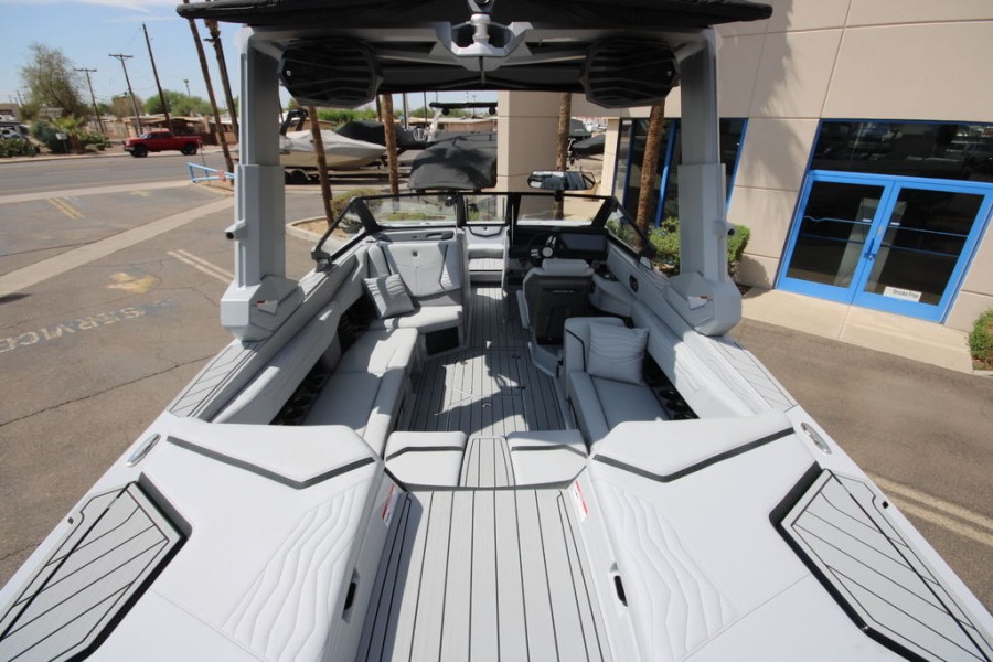 A bimini is available on every tower option, offering sun protection while its built‑in surf pocket keeps boards within reach. It blends practicality with the G23’s sleek look, keeping crew comfortable all day.