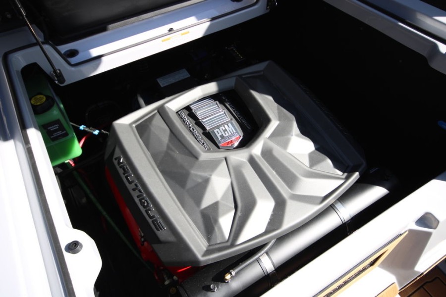 The exterior showcases Nautique’s iconic design language: faceted hull sides, angular bow, and the distinctive visual signature that makes the G25 stand out on any lake. Built with fiberglass/composite construction, it balances durability with lightweight performance for smooth handling.