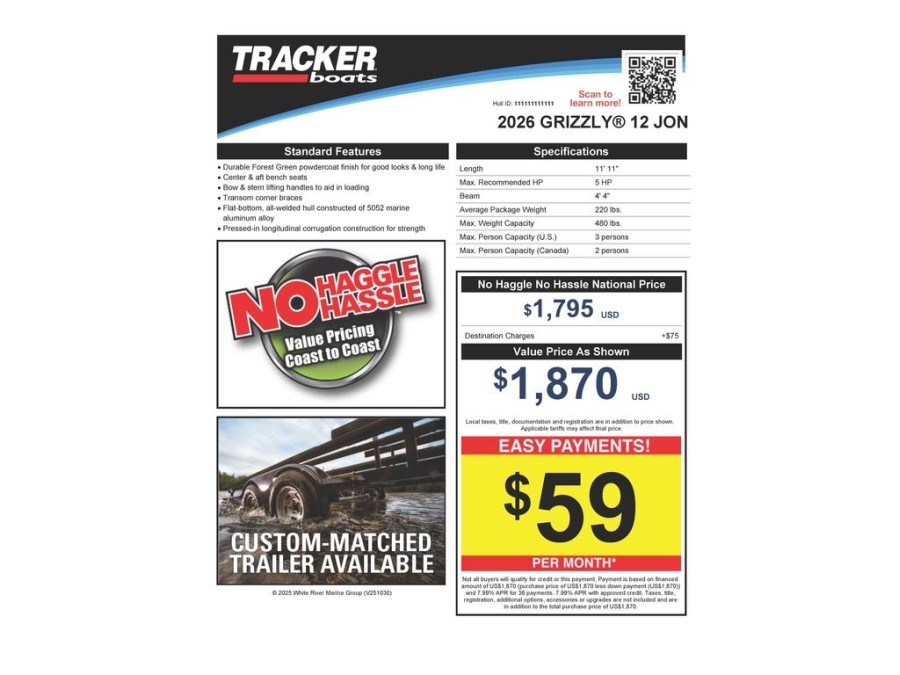 Discover the brand‑new 2026 Tracker Boats Grizzly 12 Jon, a top‑performance inflatable boat now available in Prescott Valley, Arizona.