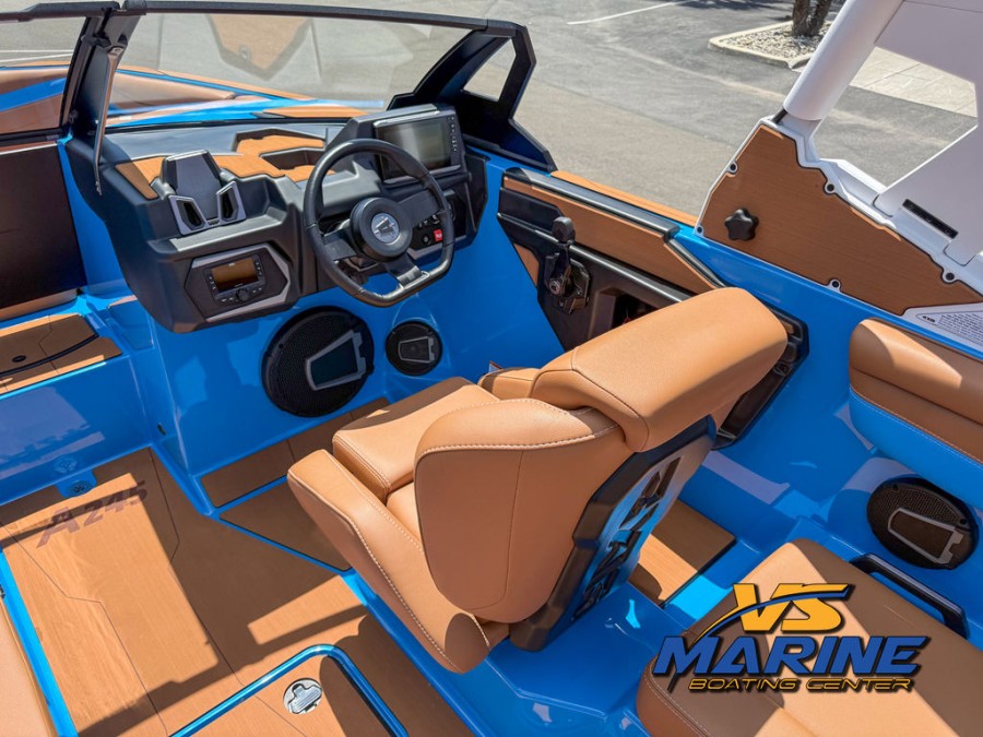 The design features are as visually stunning as they are functional. This 2026 Axis Wake Research A245 is finished in a sophisticated color scheme of ARCTIC WHITE paired with VAPOR BLUE METALLIC accents, making it an eye-catching centerpiece for any waterfront property.