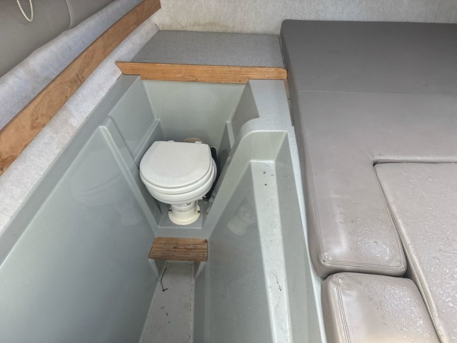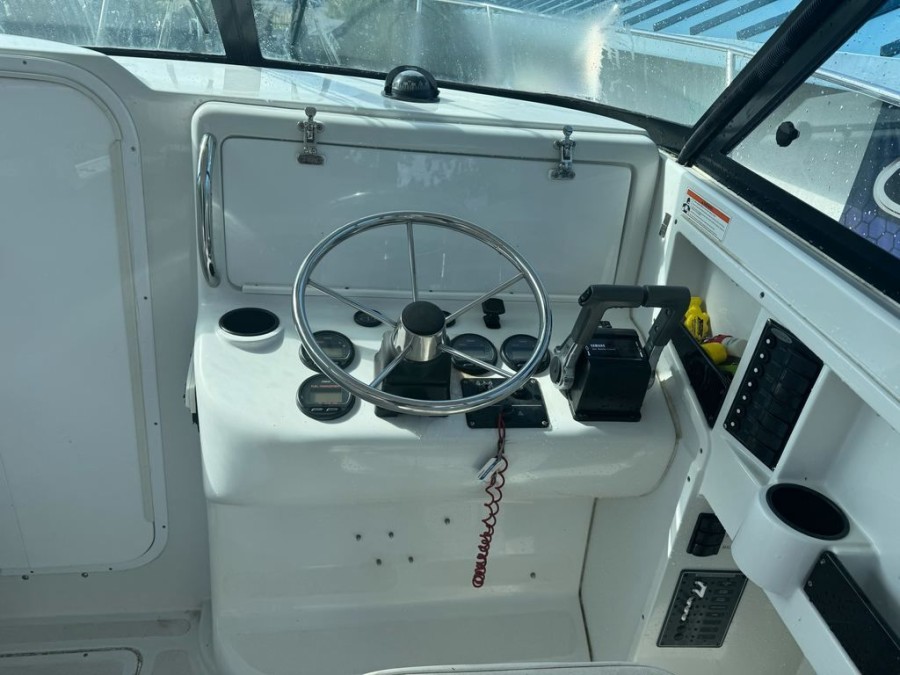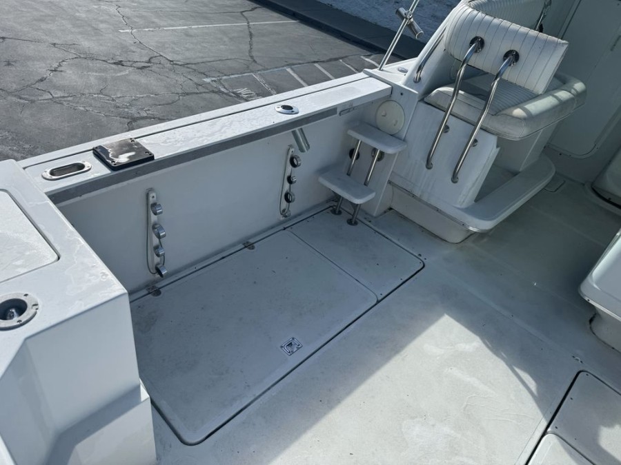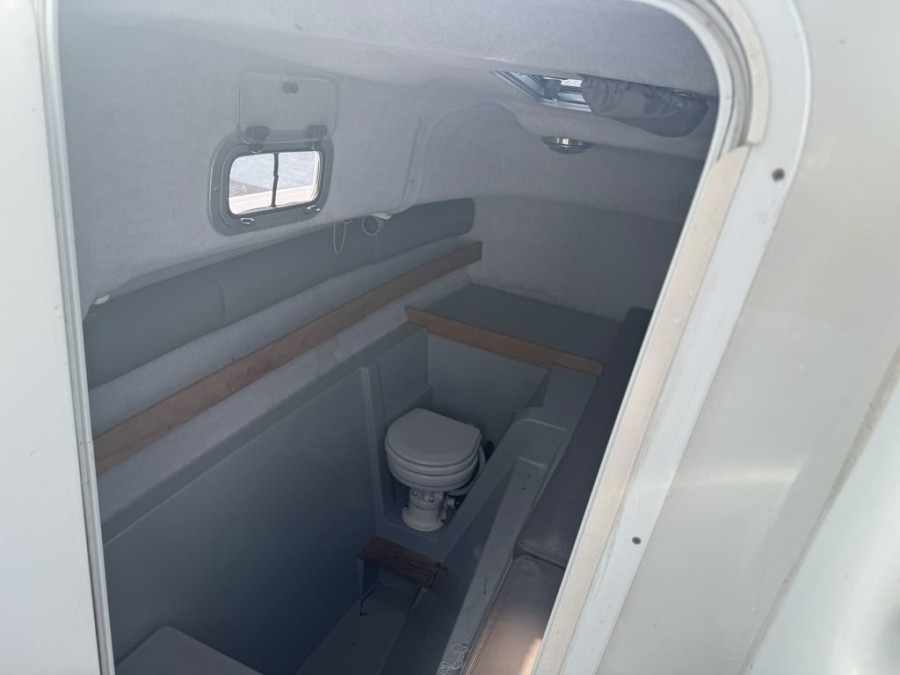 The impressive dimensions—a length of approximately 26 feet and a beam of 8'6"—give this boat plenty of usable space for family outings or serious angling trips. Constructed from durable fiberglass/composite material, the structure is built to withstand the demands of coastal life while maintaining an appealing white finish.