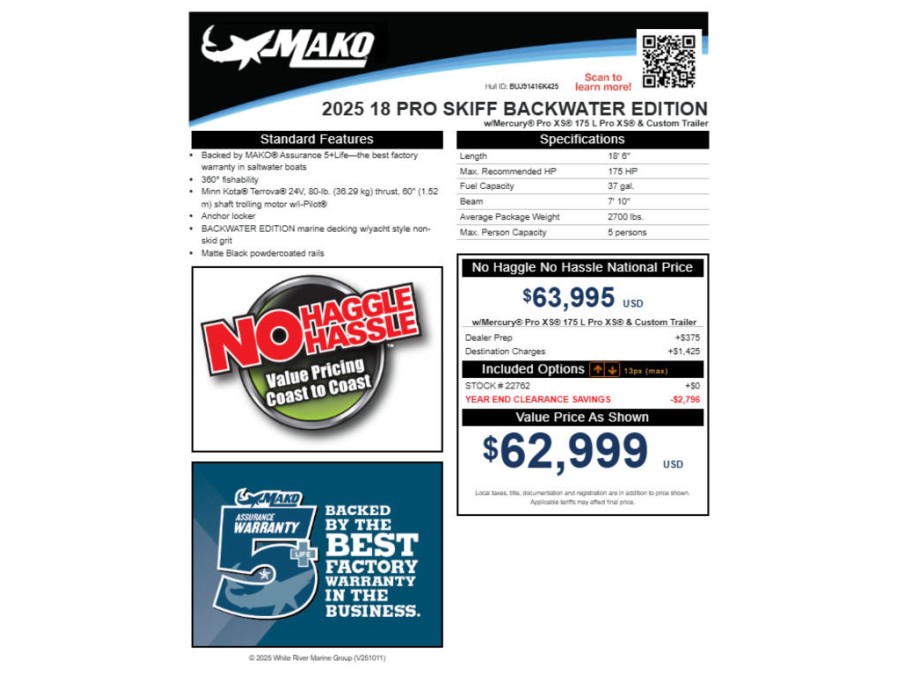 The brand‑new Mako 18 Pro Skiff Backwater is a lightweight, high‑performance fishing boat designed for inshore and nearshore adventures. With its advanced hull technology, it delivers instant planing even when fully loaded, making every mile feel effortless.