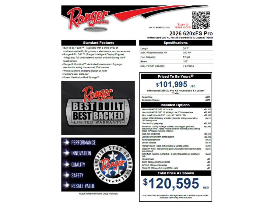 This Ranger Boats 620xFS PRO is built to deliver both performance and comfort, making it an ideal choice for serious anglers seeking reliable walleye fishing capability on the water.