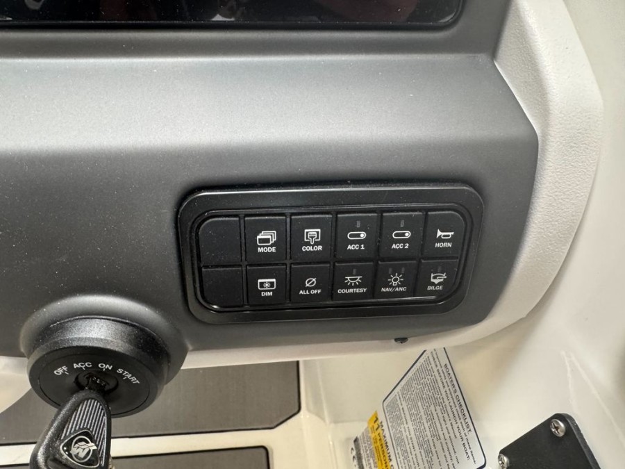 The boat features NMMA certification, an EPA‑compliant fuel system, a fire extinguisher, horn, and a robust 1 100 gph bilge pump. Navigation lights are removable at bow and stern for flexible use in varying conditions.