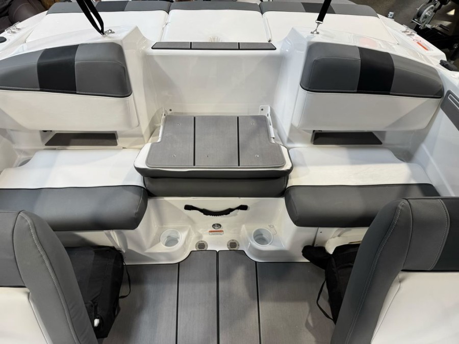 The interior boasts ample storage under seats, sun‑pad cushions with hidden compartments, a dedicated in‑floor storage area, and an anchor locker. Dual aft swim platforms with telescoping ladders make diving easy while the removable aluminum ski tow pylon supports exciting watersports.