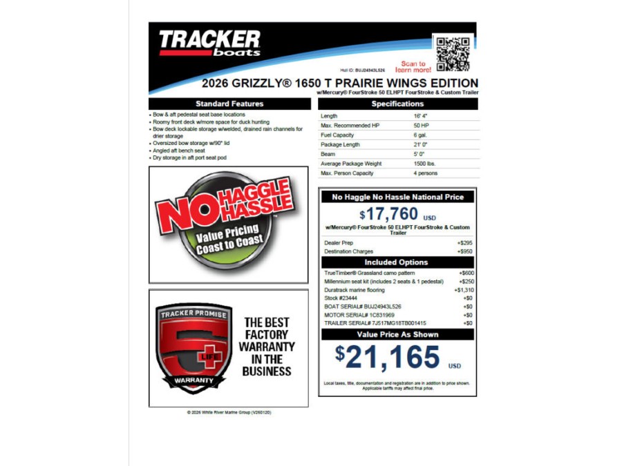 This 2026 Tracker Boats Grizzly 1650 T Prairie Wings Edition offers unmatched performance, durability and versatility for the serious angler. Explore new fishing spots with confidence knowing your boat is built to last.