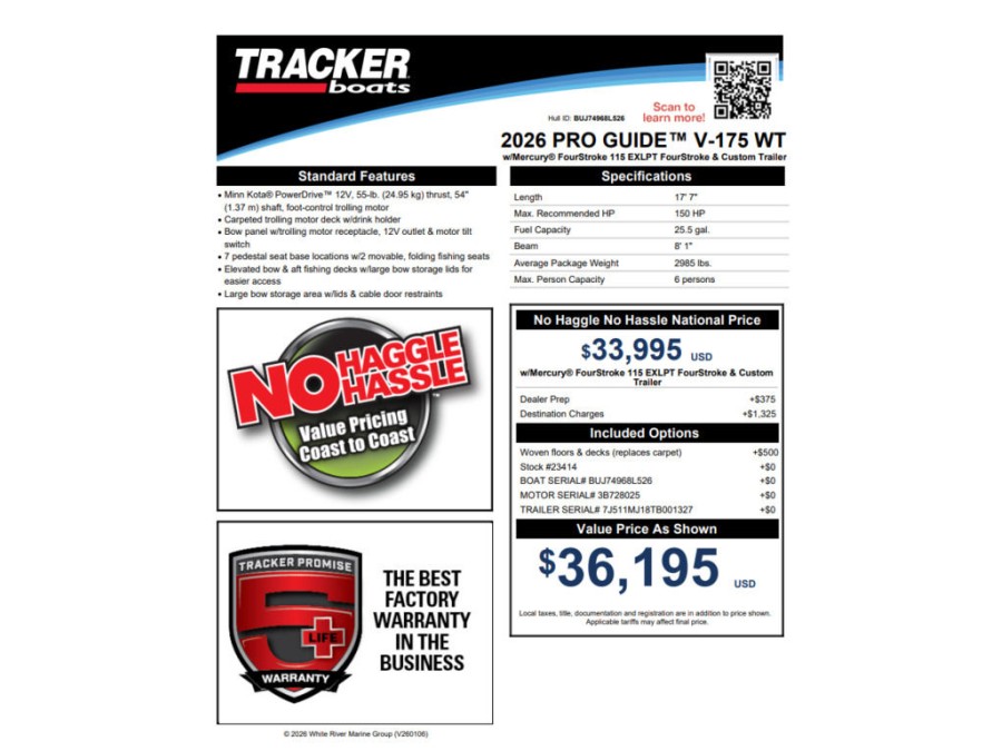 This model is ready for sale as a brand‑new vessel, offering anglers unmatched comfort, storage, and performance on the water. The Tracker® Boats Pro Guide™ V-175 WT stands out as an ideal choice for serious fishing enthusiasts seeking durability, reliability, and modern amenities in one aluminum package.