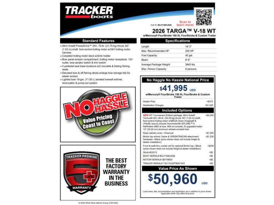 The Targa V‑18 WT is powered by a Murray Mercury® FourStroke outboard engine, complemented by a reliable 24V Minn Kota® trolling motor. A cutting‑edge Lowrance® fishfinder provides real-time sonar data for the most productive fishing experience.