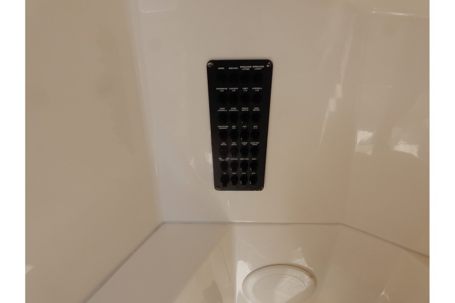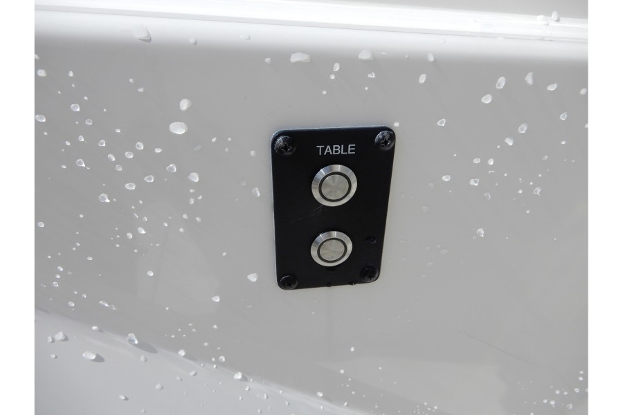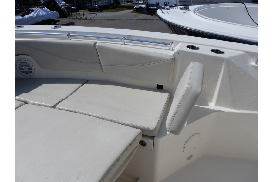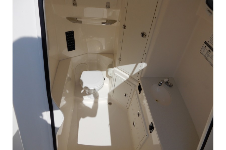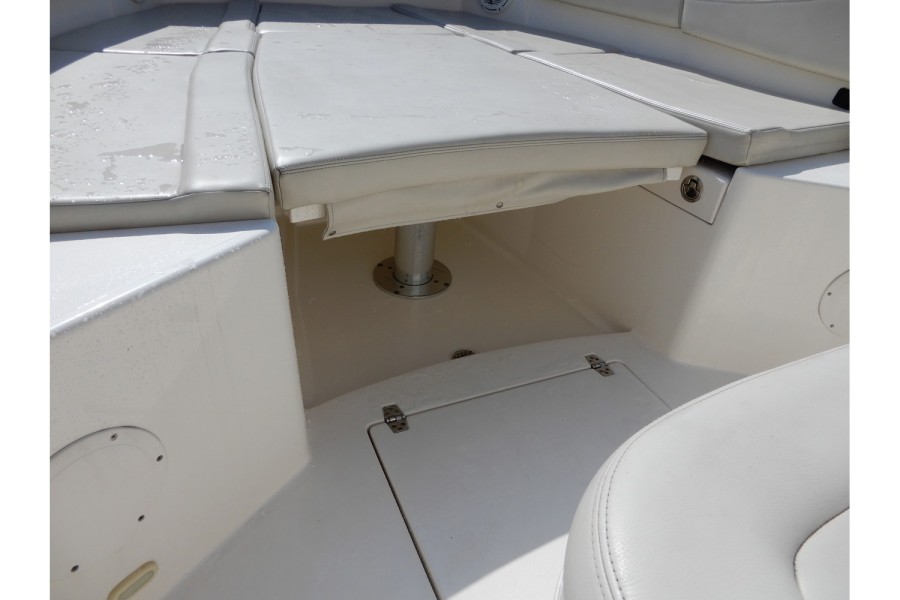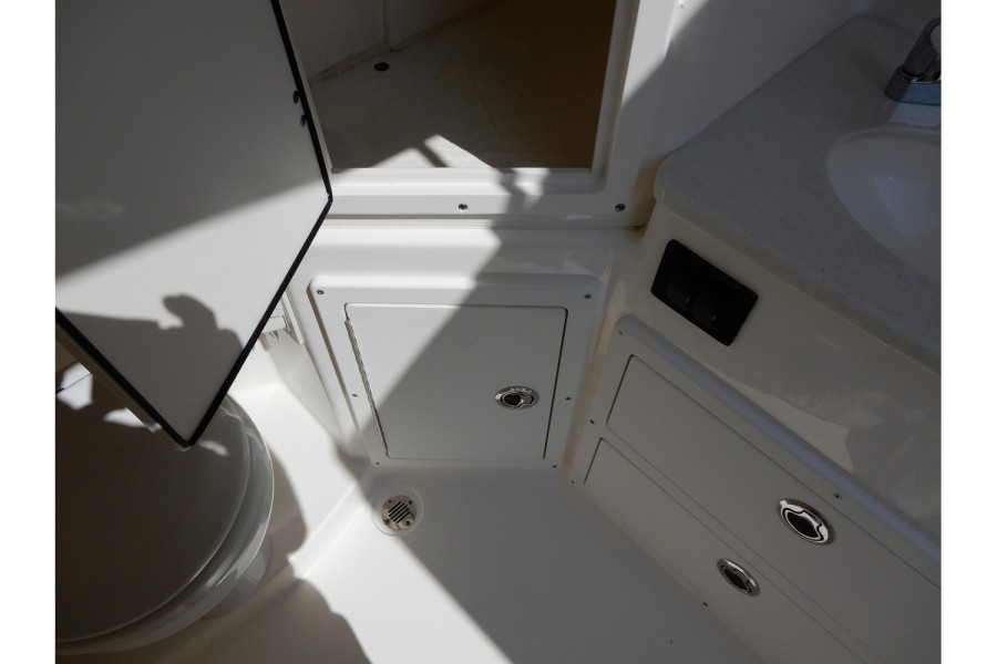 The cockpit spans over 82 square feet, featuring an unobstructed layout with ample seating. The forward entry head offers more than six feet of headroom, while the electric bow table adds a touch of convenience for meals or fishing prep.