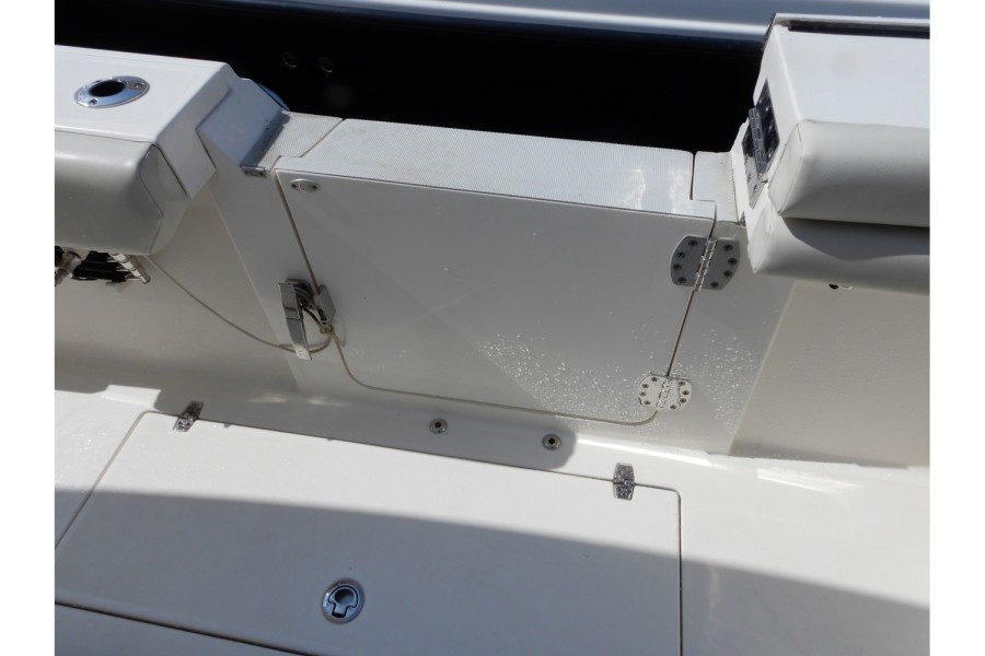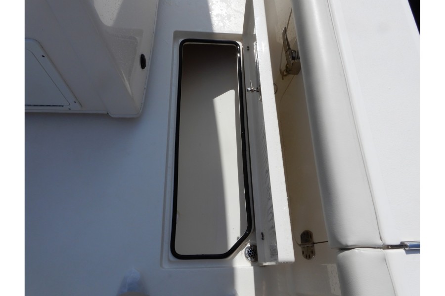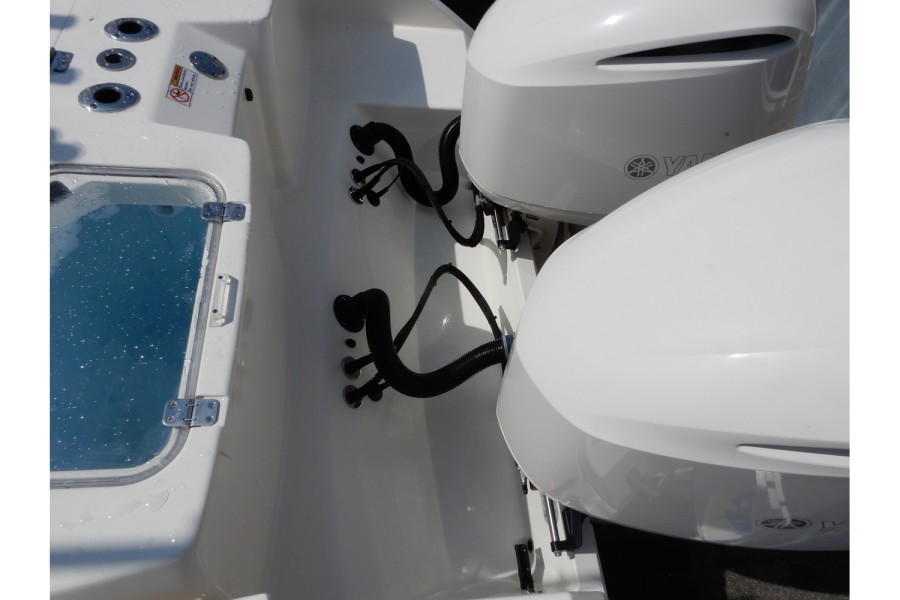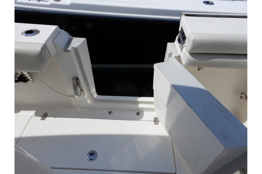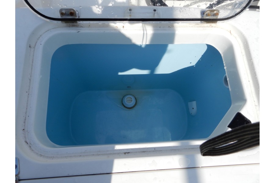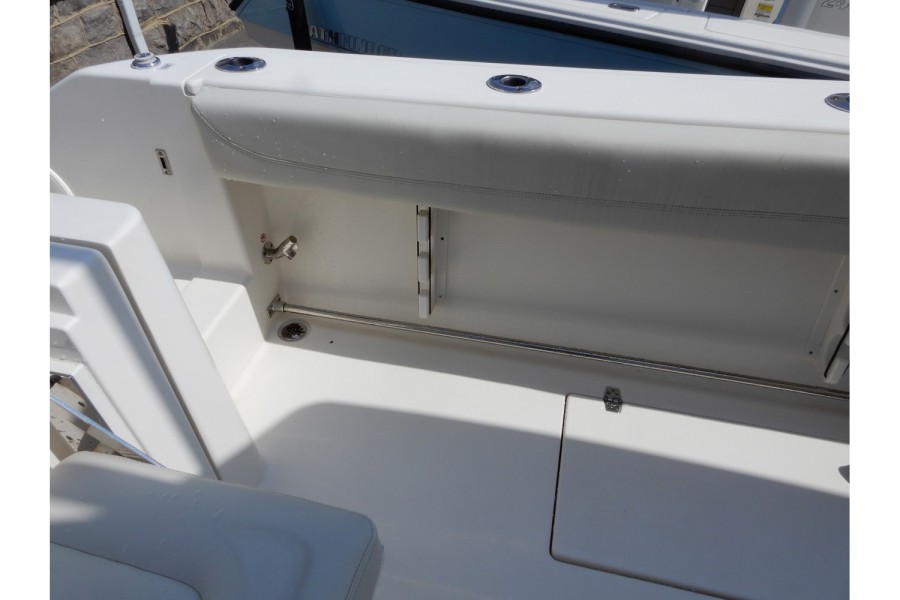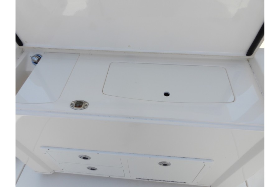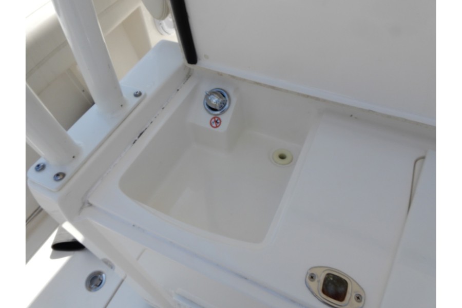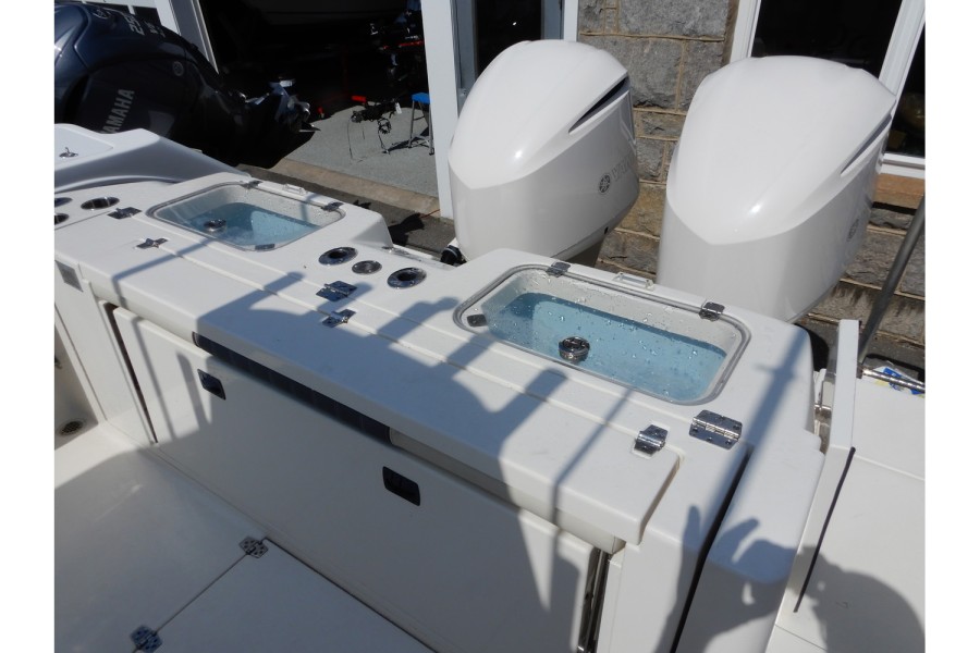 The 320 CC is equipped with large livewells (70 gallons combined) and under‑gunwale rod storage. Twin pressurized livewell tanks keep your catch fresh, while the deck features a dedicated tackle center complete with sink and bait prep area.
