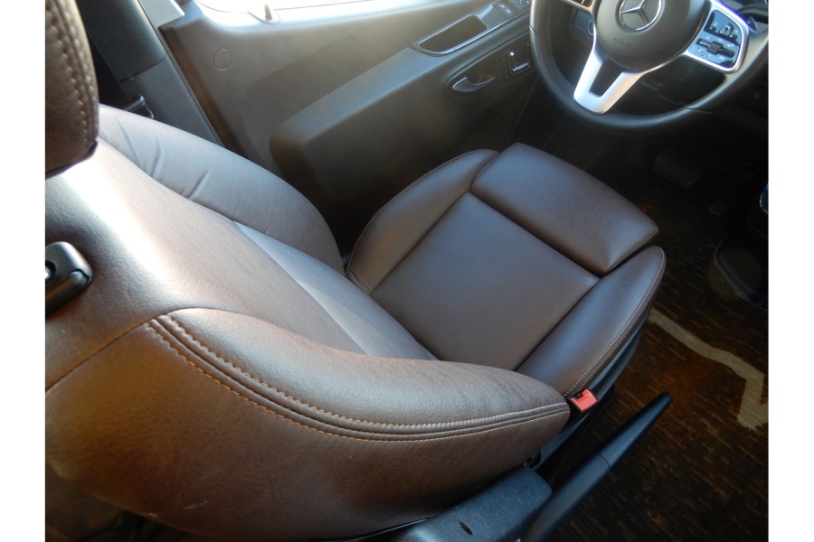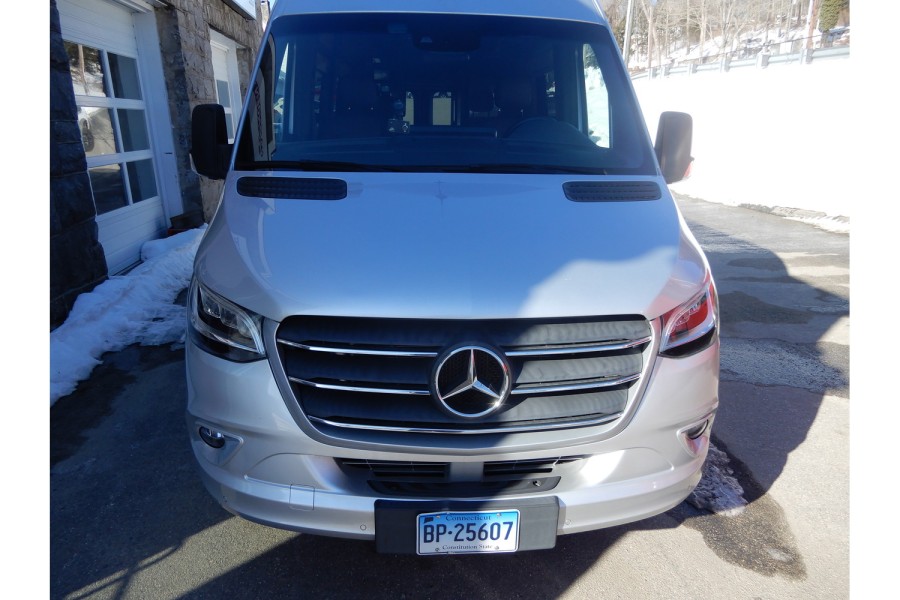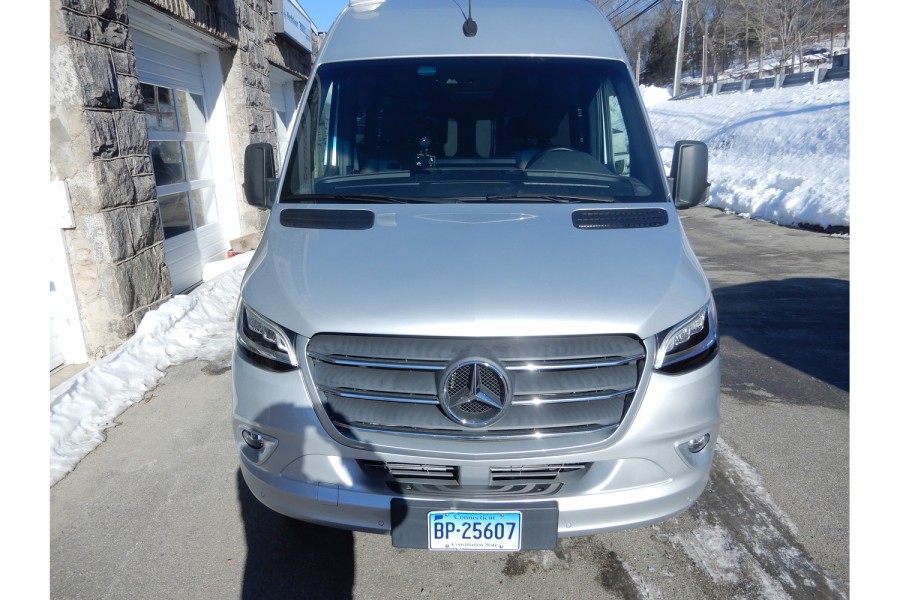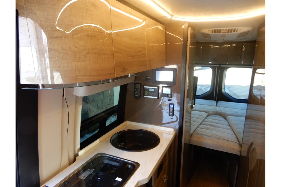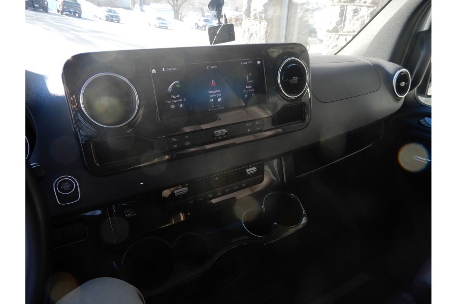 The MBUX touchscreen infotainment system includes navigation, Wi‑Fi hotspot capability, intelligent voice control and a built‑in rear camera. The Precision Plex app (Android/iOS) allows remote monitoring of power usage. USB charging ports are available throughout the cabin.