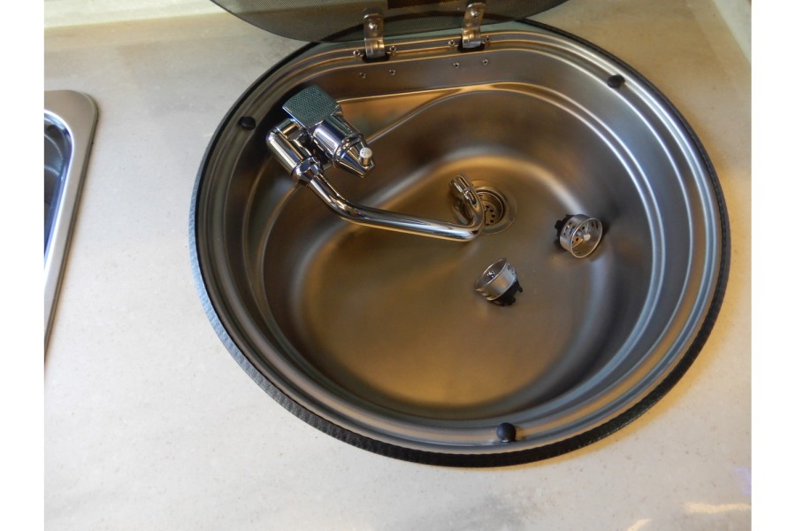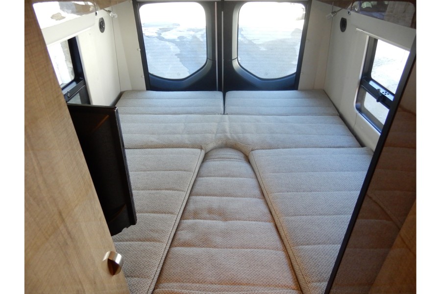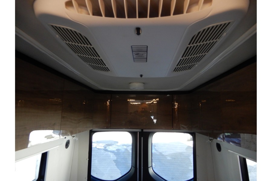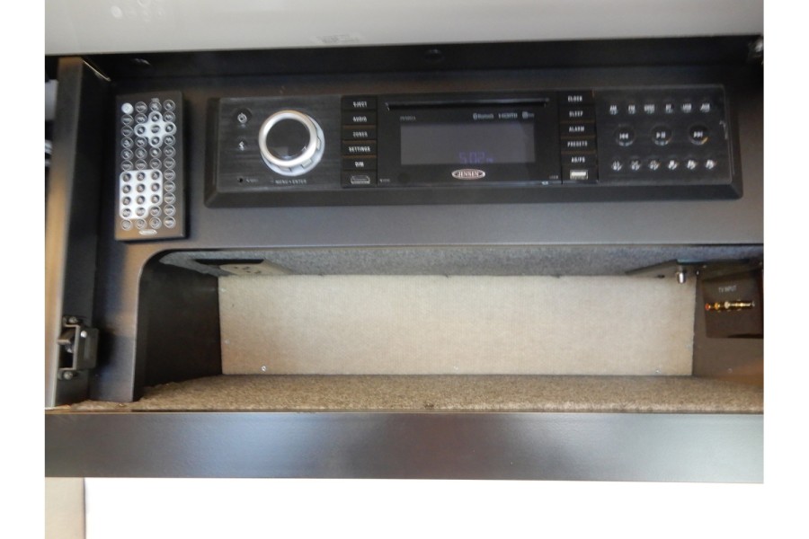 The interior offers spacious living with adjustable leather seats that include lumbar and headrest support. Dual airbags and power steering enhance safety, while a rear camera assists in parking. The cabin is fitted with a 24‑inch HDTV that swivels for outdoor viewing.