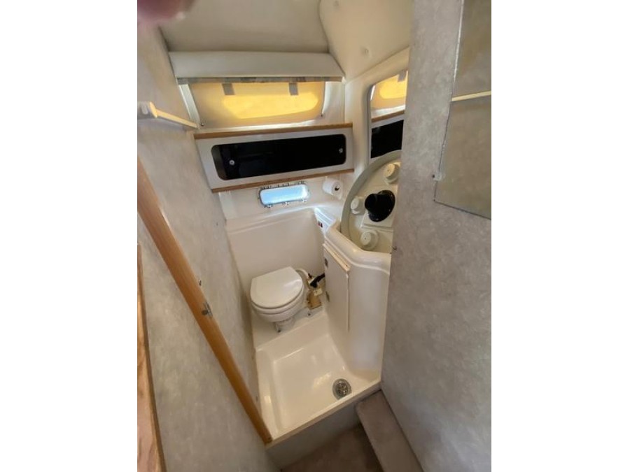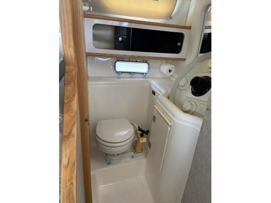 Step aboard to discover thoughtfully designed living quarters perfect for relaxation and entertaining. The layout features a comfortable V-berth yacht sleeping area at the aft end of the boat. Galley amenities are fully equipped, including a stove, microwave, dining table, and dedicated head facilities, making it truly self-sufficient.