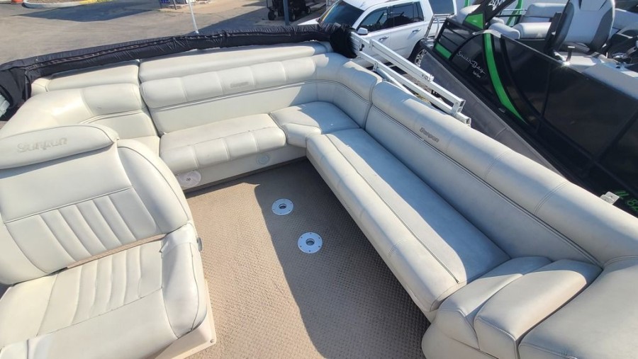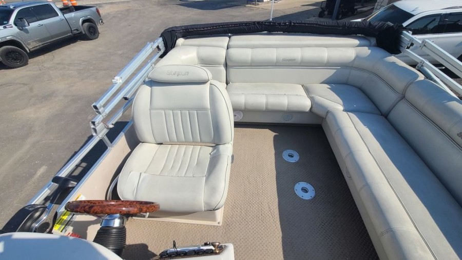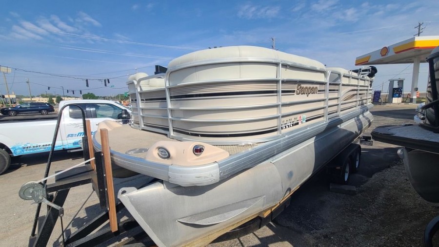 This specific San Pan Godfrey unit comes equipped with essential features designed to enhance your boating experience, making navigation simple and enjoyable. It includes both a stereo system for entertainment and an integrated depth finder for precise fishing efforts.