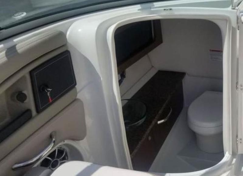 Bow seating resembles “hot tub” style cushions for relaxed lounging and includes flip‑up arm rests as standard. The enclosed head compartment features granite countertops, a handheld shower, pressurized water system, electric flush toilet, holding tank, and storage netting.
