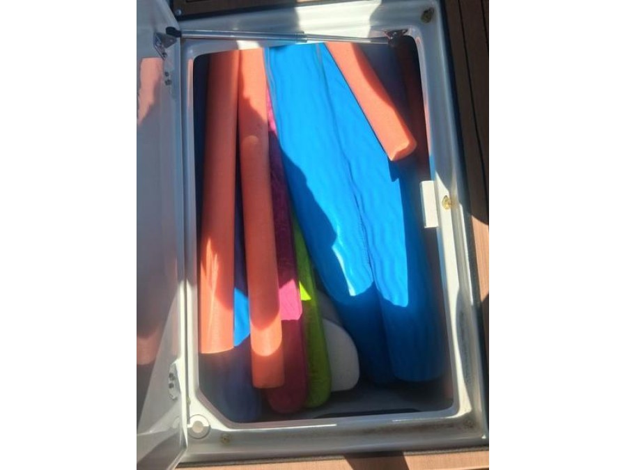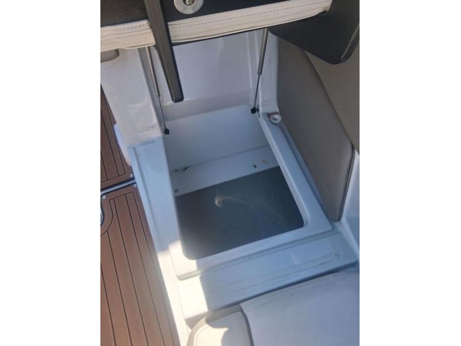 The cockpit is designed around a roomy J‑wrap layout, providing plenty of conversation space. Large storage compartments keep gear organized while the side‑mount table stows neatly in an undermount drawer when not needed.