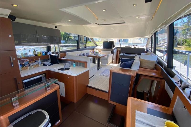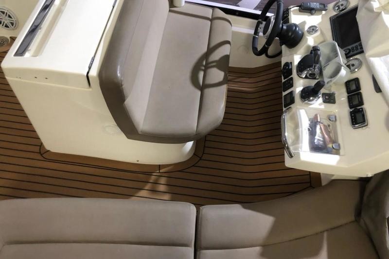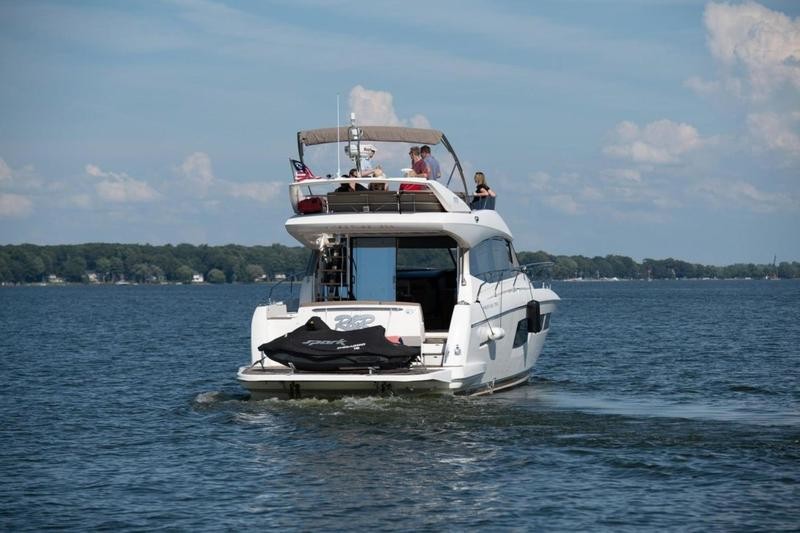 The flybridge is the heart of the boat, offering generous seating, dining space, and excellent visibility while underway or at anchor. Recent upgrades include new synthetic teak on the flybridge, comfortable seat covers throughout, a large hydraulic swim platform for effortless swimming and launching the Sea‑Doo, and wide side decks that lead safely forward to additional sunspace.