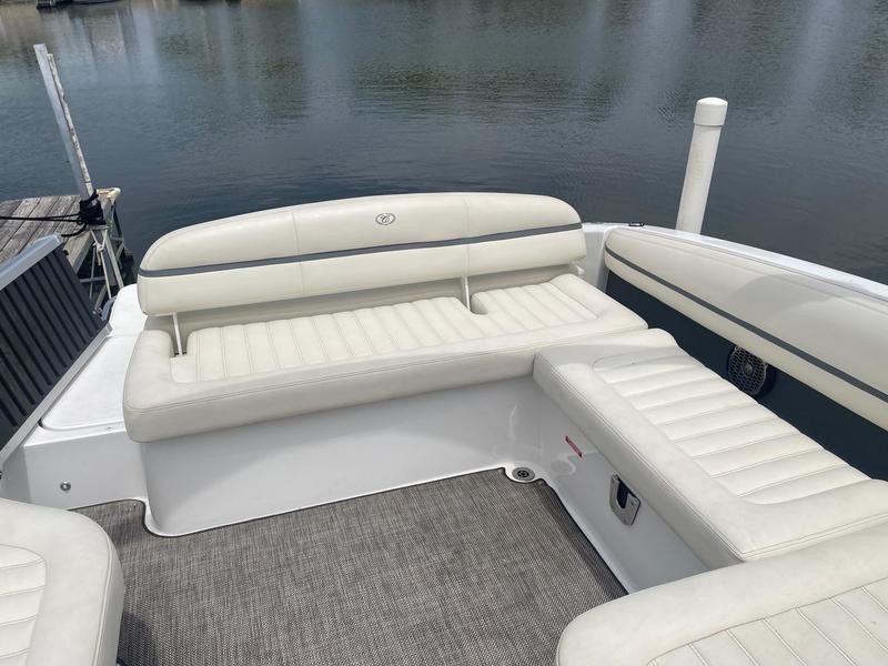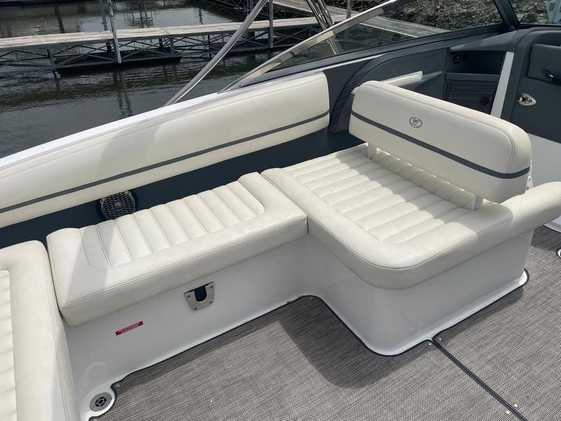 Inside the cabin you’ll find versatile seating: a double‑wide seat with adjustable backrests ahead of the port console, a conversation‑friendly L‑lounge along the transom, and a love seat behind the helm. The sun pad can be flipped to provide an extra backrest for the rumble seat. All seats are wrapped in durable Nautiflex vinyl that withstands weather conditions.