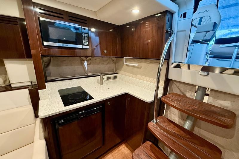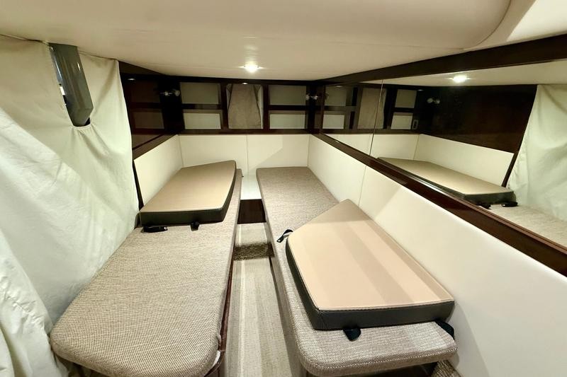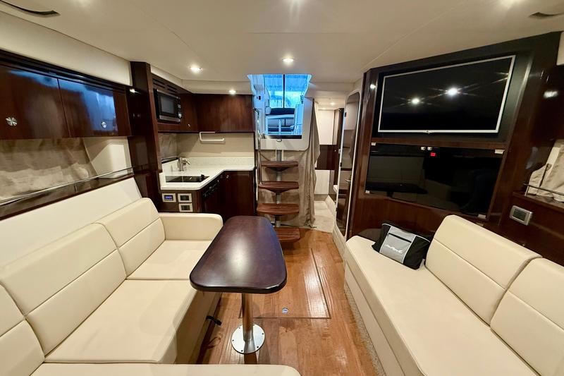 The cabin showcases hardwood flooring and dark cherry cabinetry. The salon offers a berthable starboard couch for additional overnight guests. A fully equipped galley—refrigerator, two‑burner cooktop, convection oven, and sink—supports weekend stays or extended cruising.
