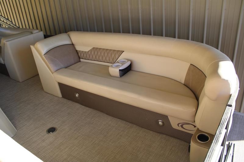 The interior layout follows classic pontoon design: dual sofa seating at the bow and a spacious L‑shaped lounge aft with a center table. The swing‑back section of the lounge offers rear‑facing seats that extend onto a large sun pad for ultimate relaxation. A generous locker behind the helm provides ample storage or can conceal trash, while the dedicated captain’s chair ensures comfort during navigation.