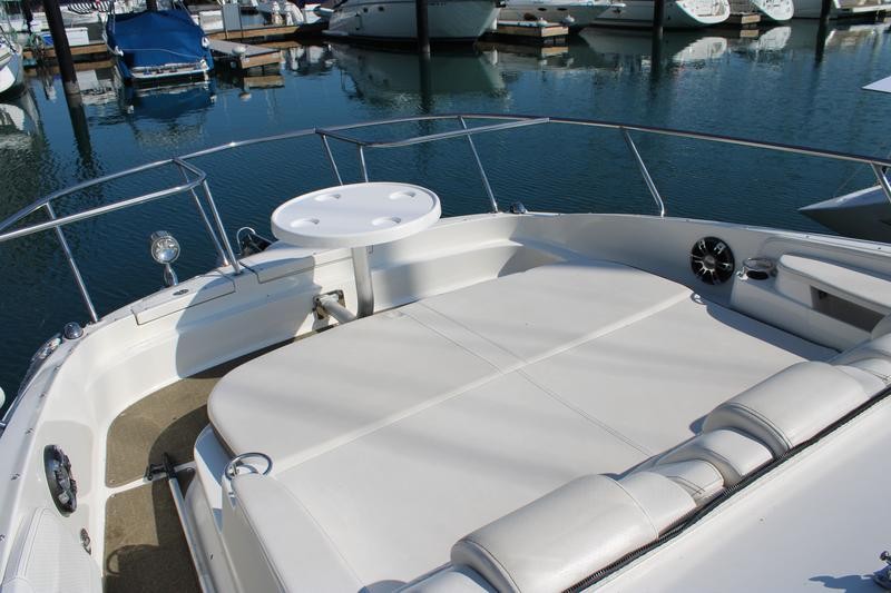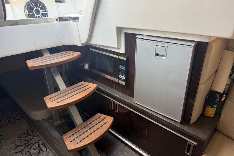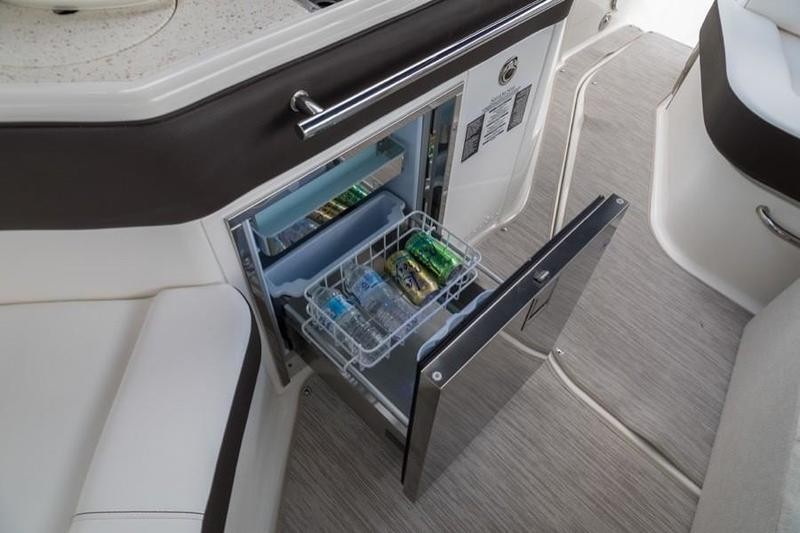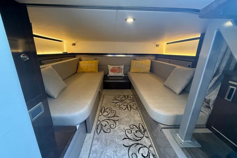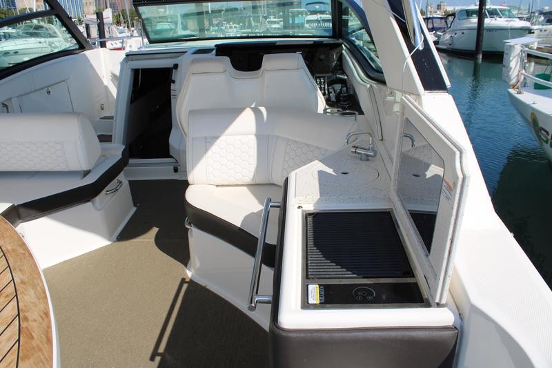 The bow lounge area offers actuated headrests and armrests, ensuring maximum comfort while underway or at anchor. The cockpit features a reversible helm companion seat that can face aft, a standard wet bar complete with sink and storage, and optional refrigerator and grill upgrades. Inside, the cabin comfortably sleeps four and includes extending countertops, flatscreen TV, and ample storage.