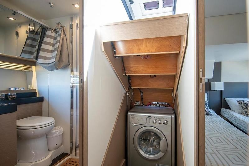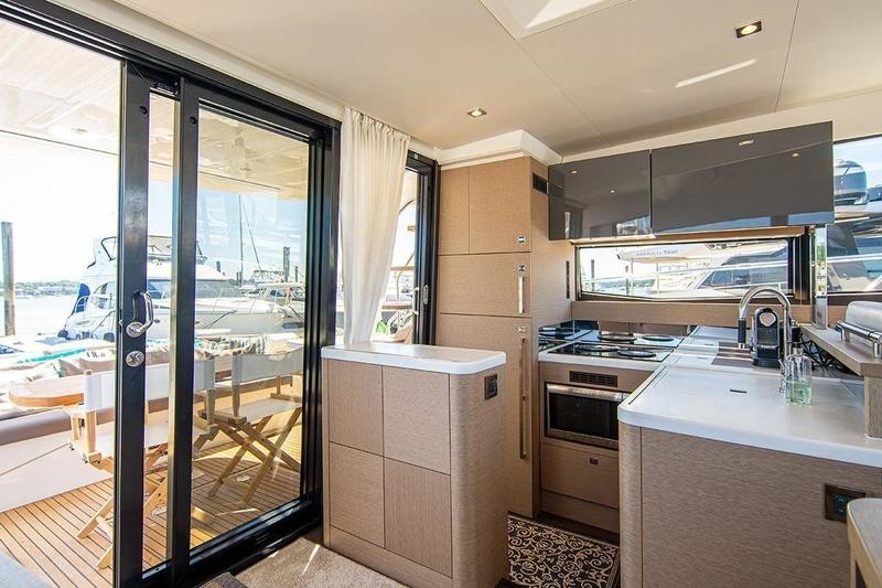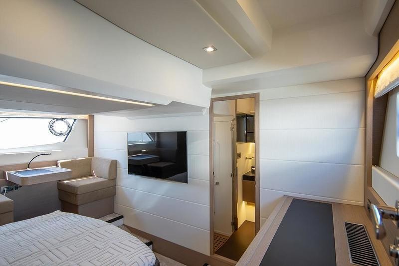 The salon is illuminated by large panoramic windows, creating an airy atmosphere with comfortable seating and a modern galley. Below deck are three well‑designed staterooms: a full-beam master cabin with private access, plus two guest rooms that support overnight stays or extended cruising.