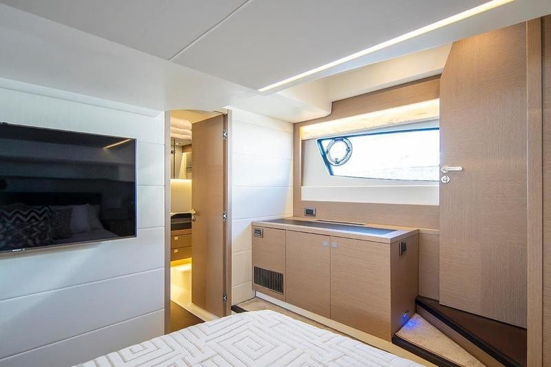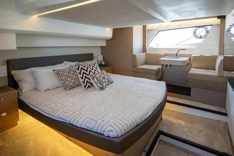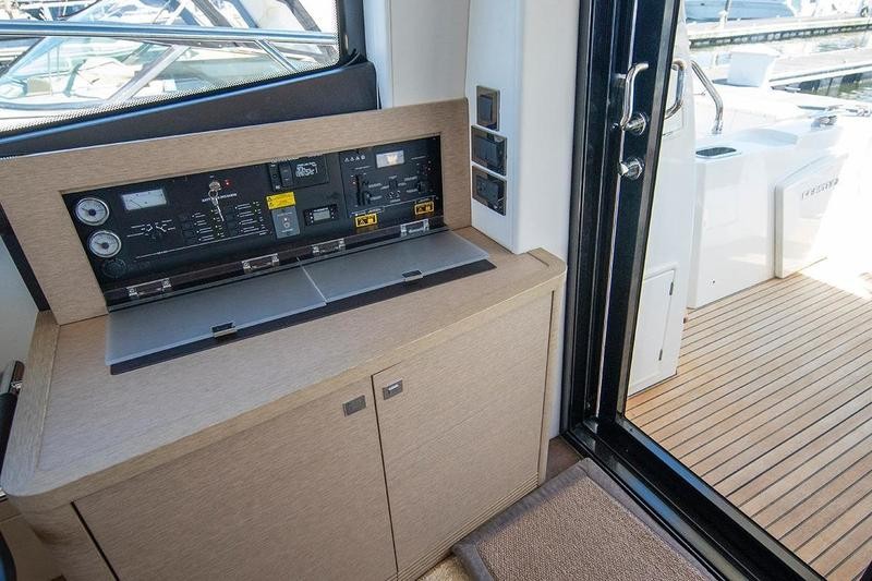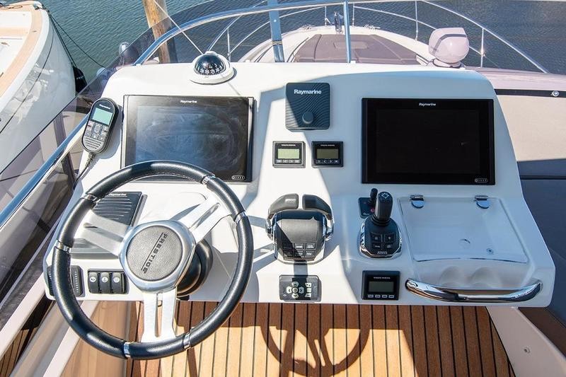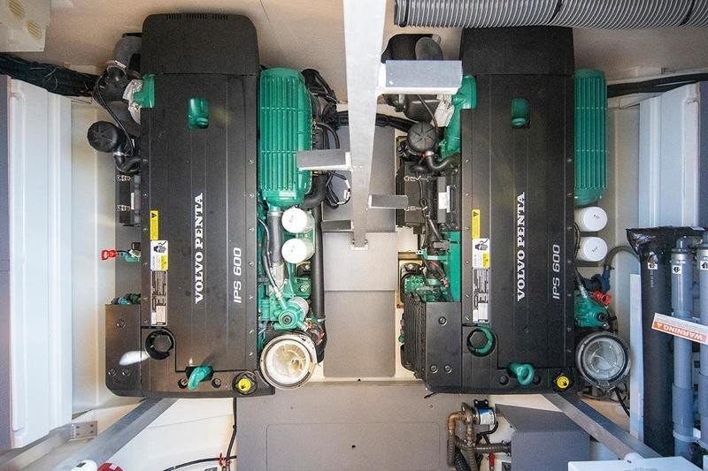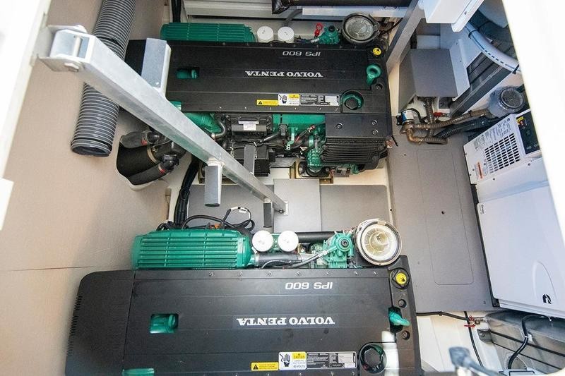 The vessel runs on twin Volvo Penta IPS 600 engines that deliver reliable power and excellent fuel economy. Joystick control simplifies maneuvering in tight spots, while an aft docking station provides clear visibility for safe berthing.