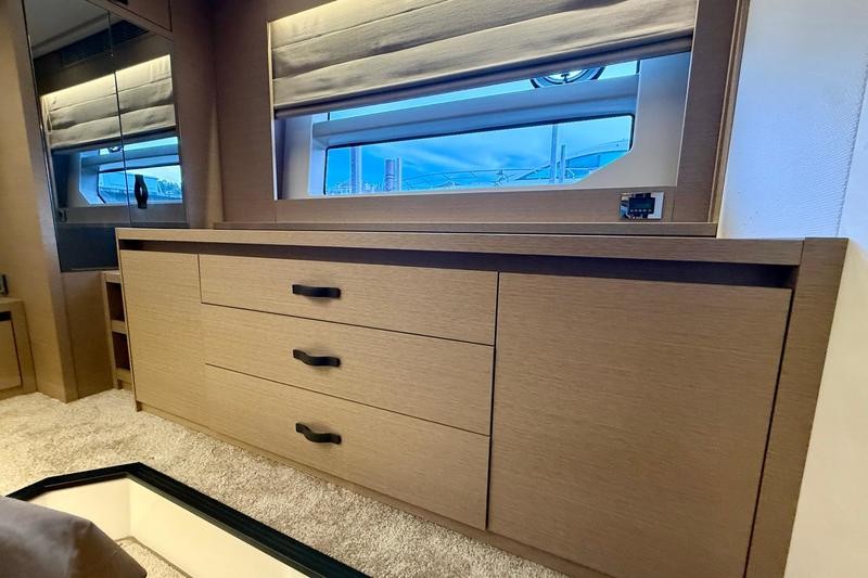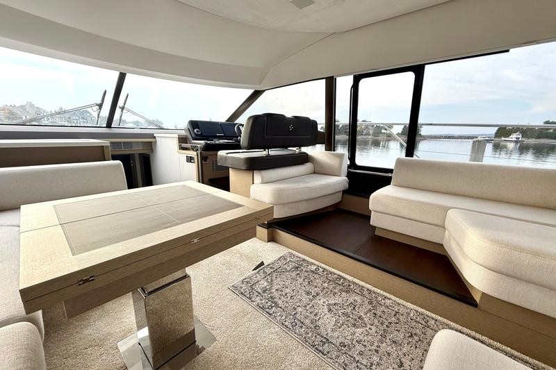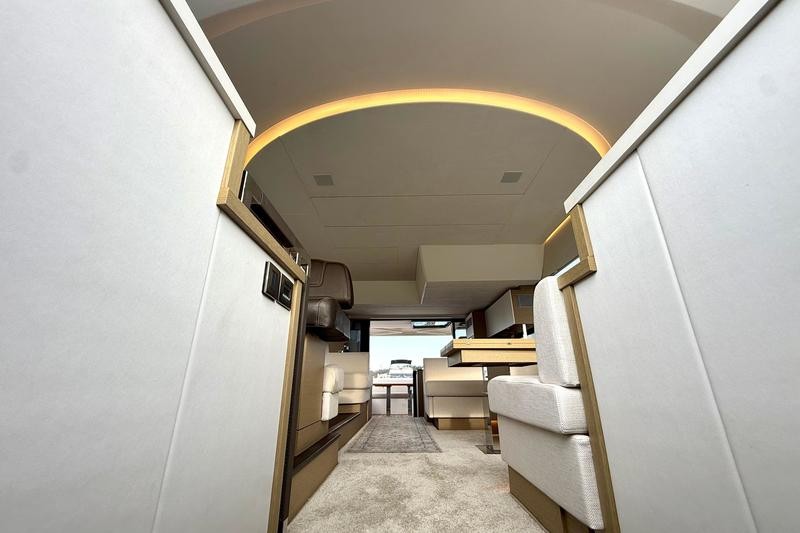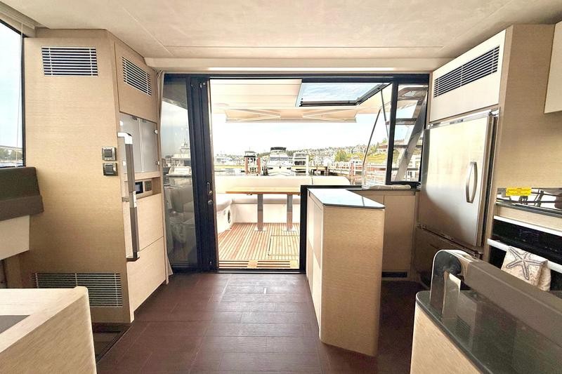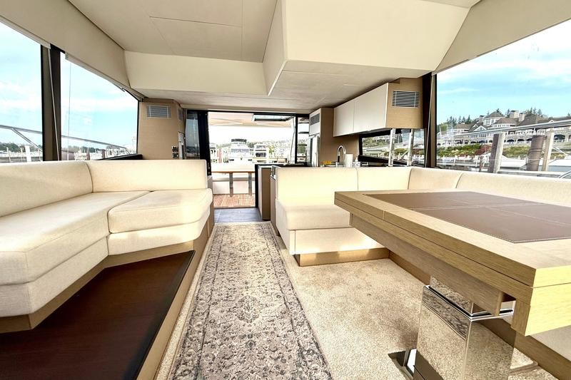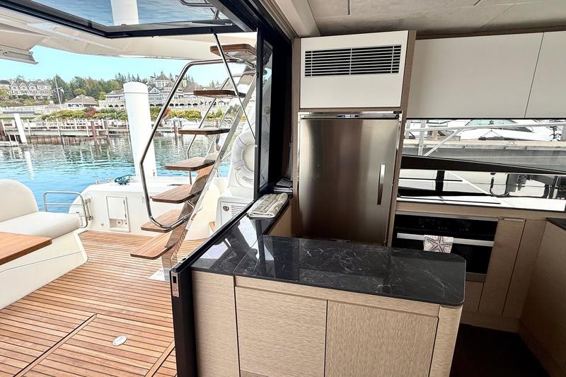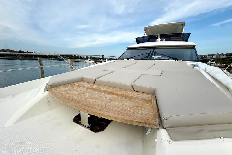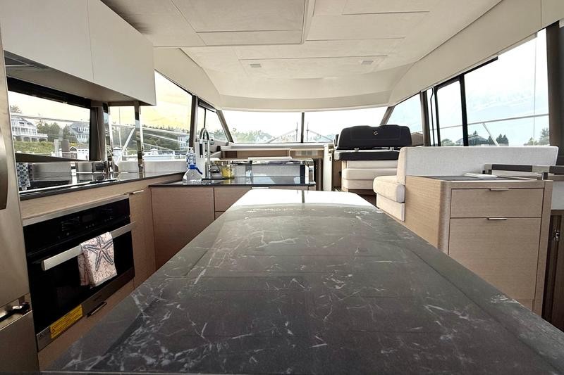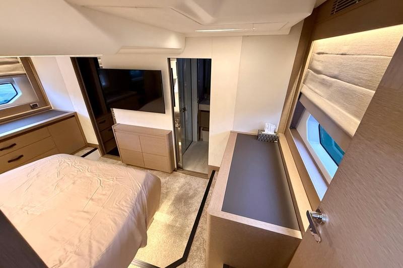 The galley flows directly into the cockpit for effortless entertaining, while the flybridge and foredeck lounges expand outdoor living space. A private stairway leads to a full-beam primary suite that offers separation from guests – a true penthouse feel on water.