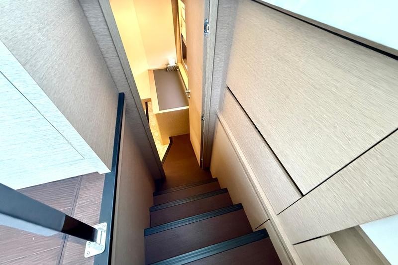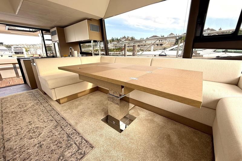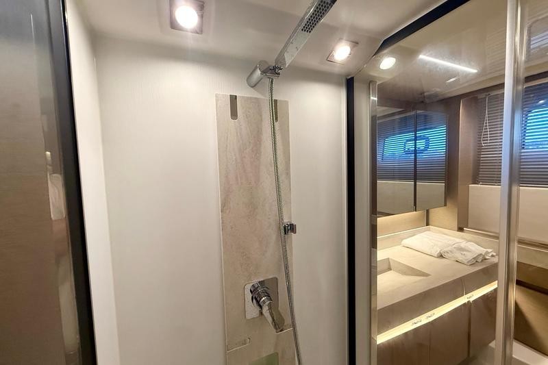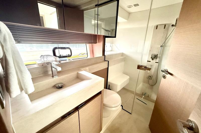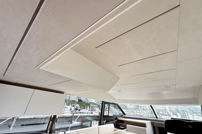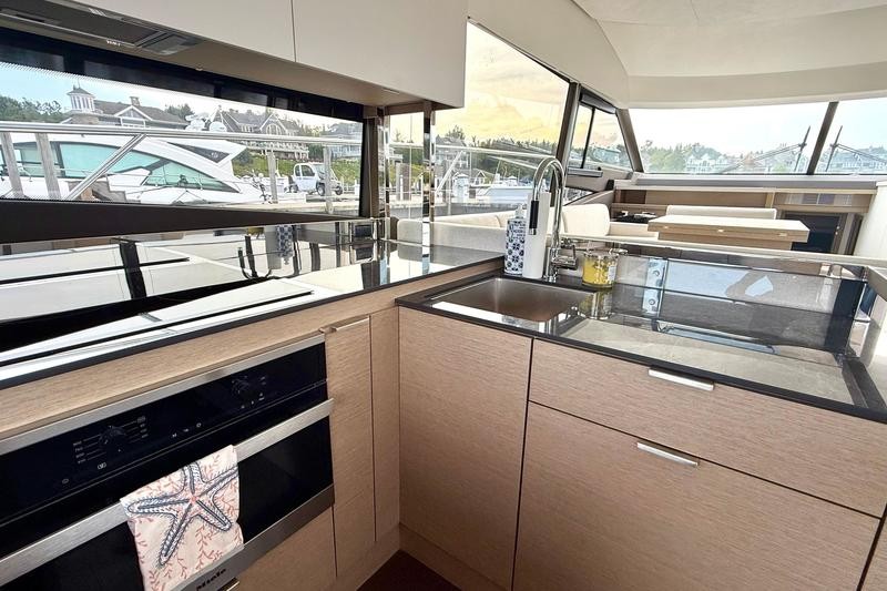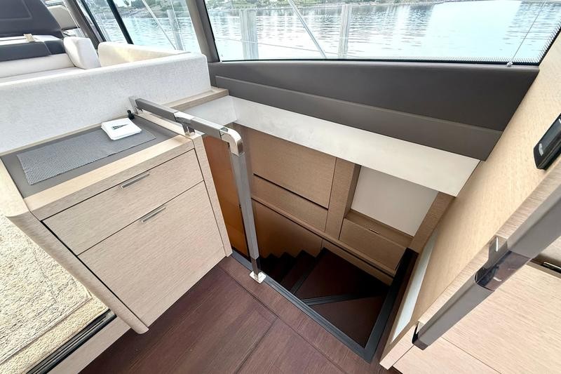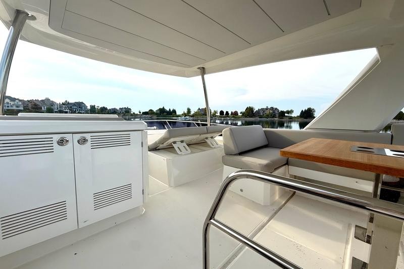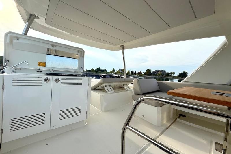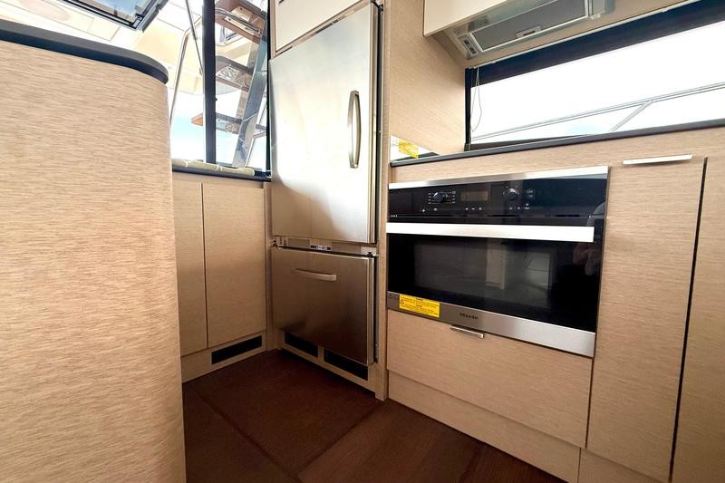 The galley flows directly into the cockpit for effortless entertaining, while the flybridge and foredeck lounges expand outdoor living space. A private stairway leads to a full-beam primary suite that offers separation from guests – a true penthouse feel on water.