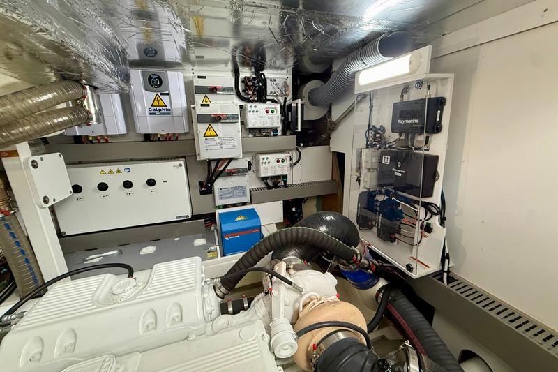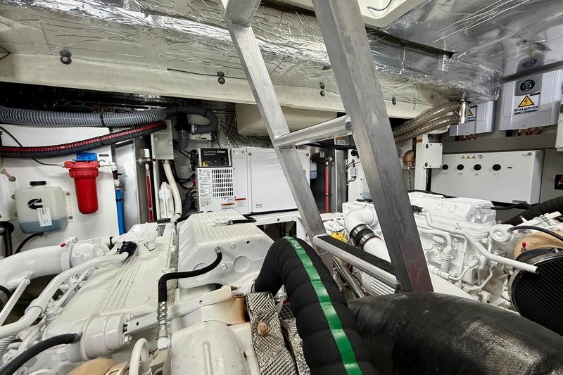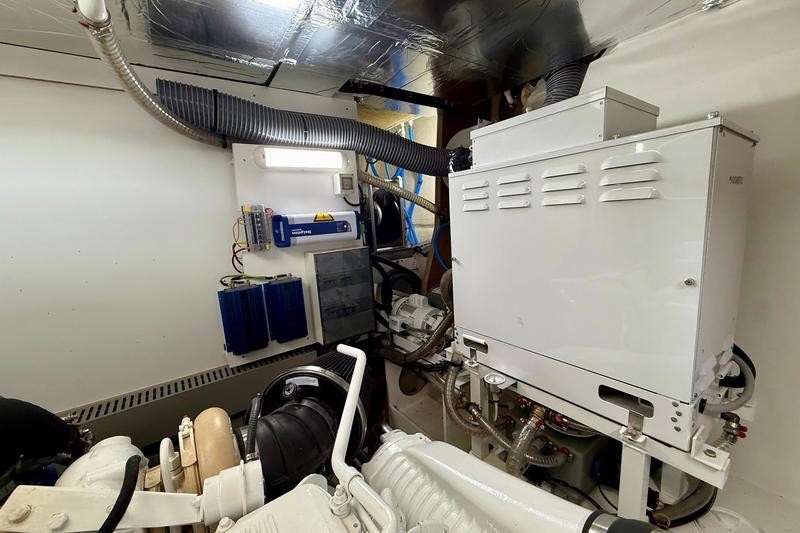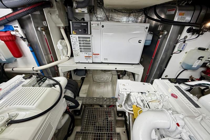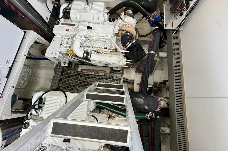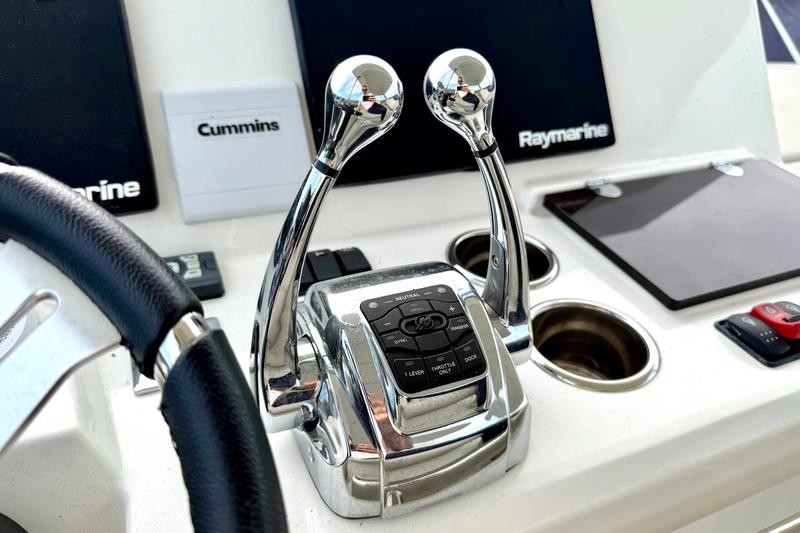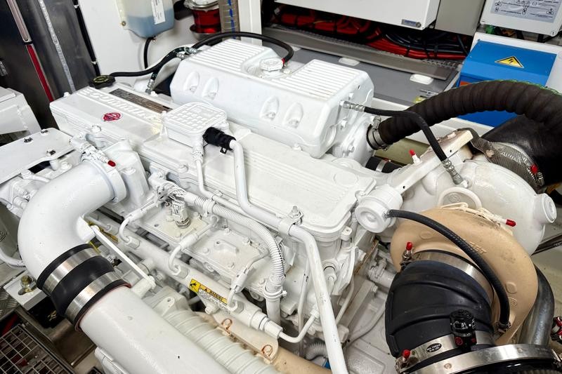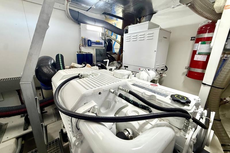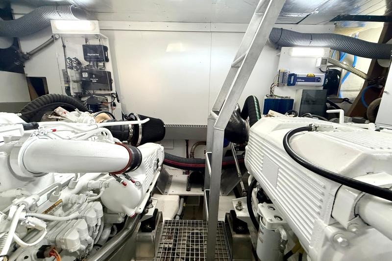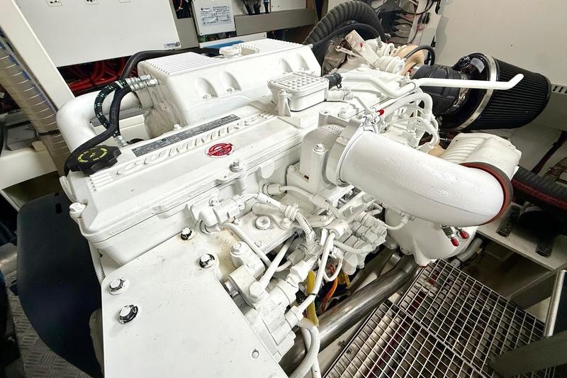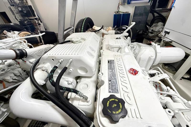 A joystick docking system, Skyhook position-hold capability, and glass-bridge electronics make navigation simple even in busy marinas. The wide chines provide stability for a quiet ride powered by robust Cummins engines with only 150 original hours.