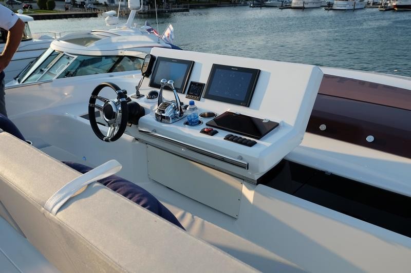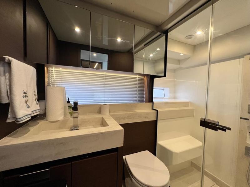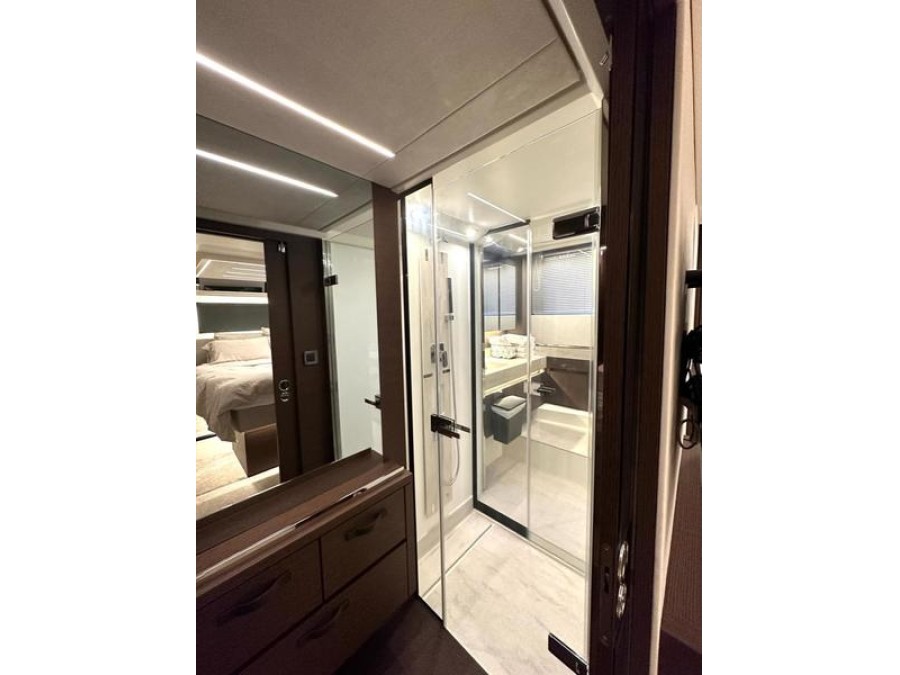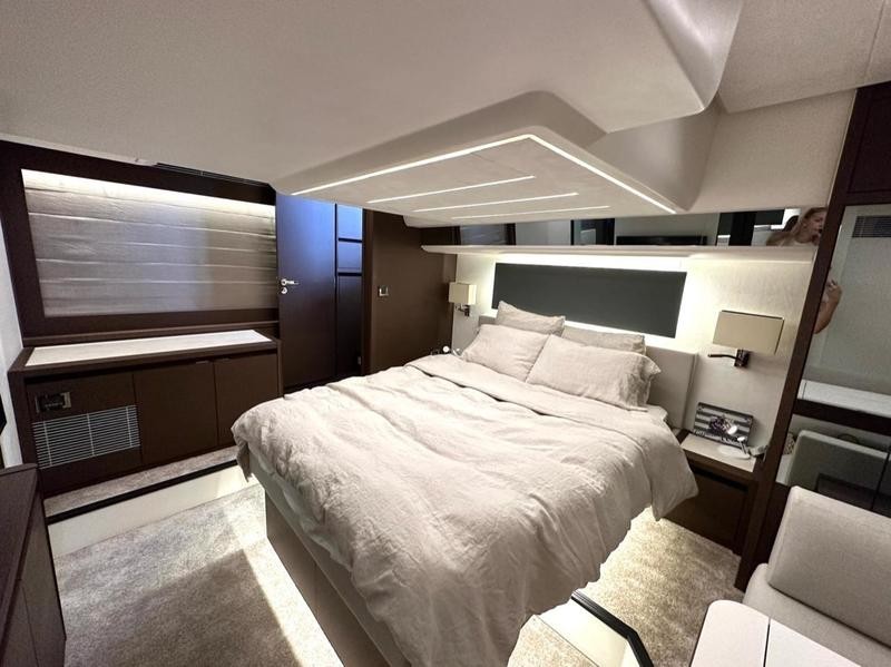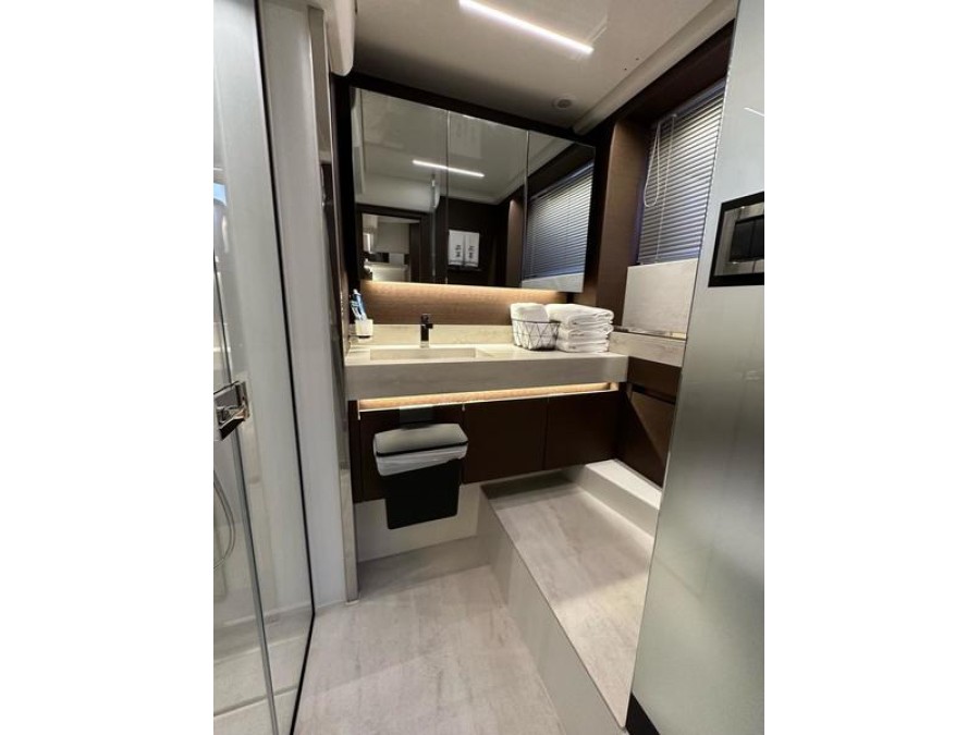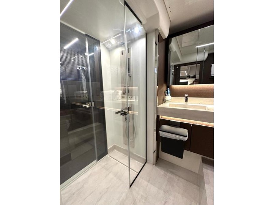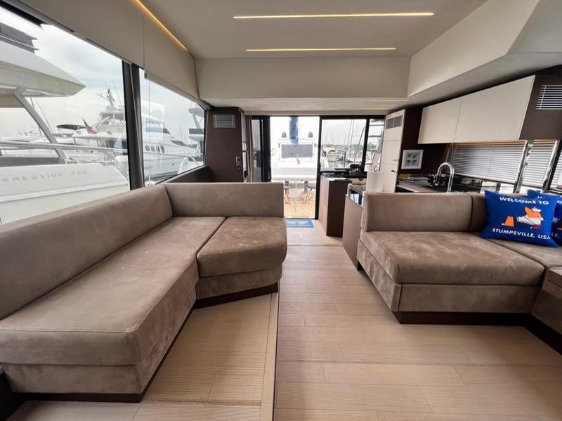 The Prestige 590 Sport Fly merges sleek, sporty lines with premium comfort. A large electric sunroof opens over the saloon, while a generous flybridge offers panoramic views. The hull’s elongated shape and expansive windows enhance both aesthetics and visibility on open water.