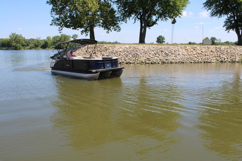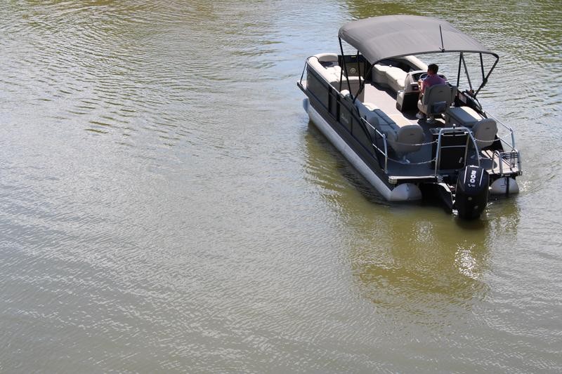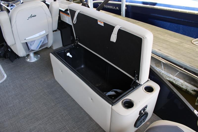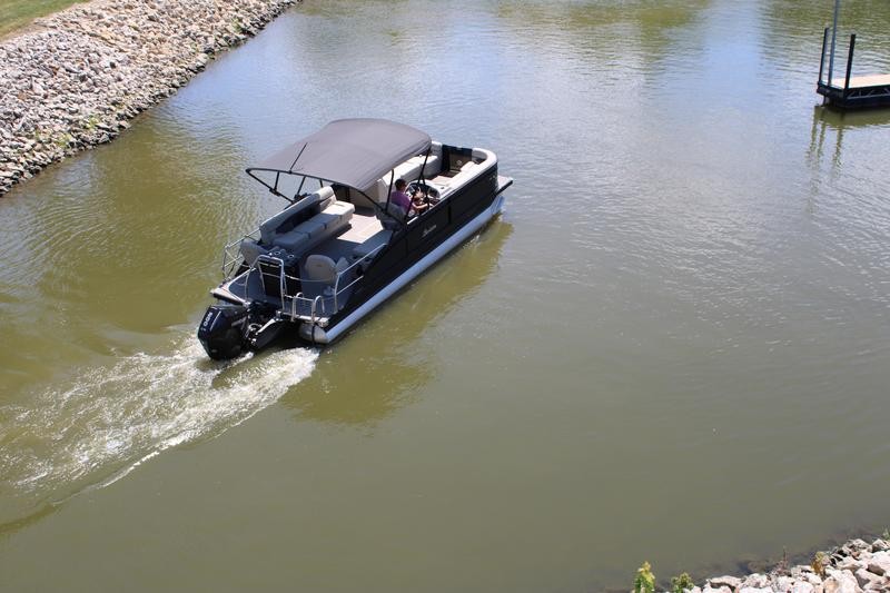 The boat arrives in striking Blue Sapphire Railskin with a Blackout Package that catches sunlight beautifully. Inside, Marino Gray furniture pairs with Amore Gray flooring to create an inviting atmosphere. The Tri‑Toon package enhances stability and features built‑in storage within the central toon. A Metal Jacket Protectant keeps the tonns gleaming.