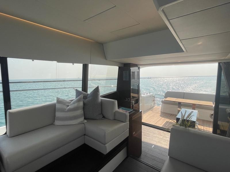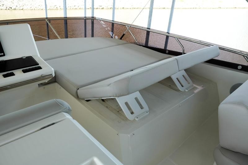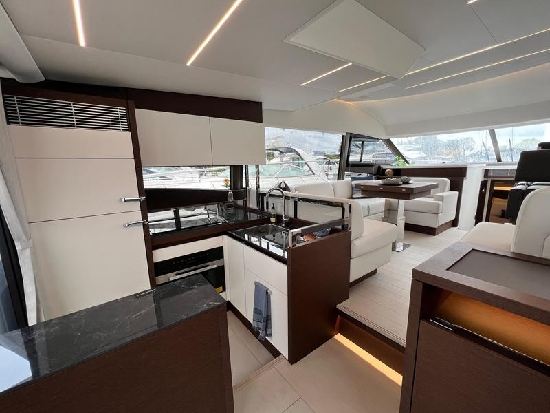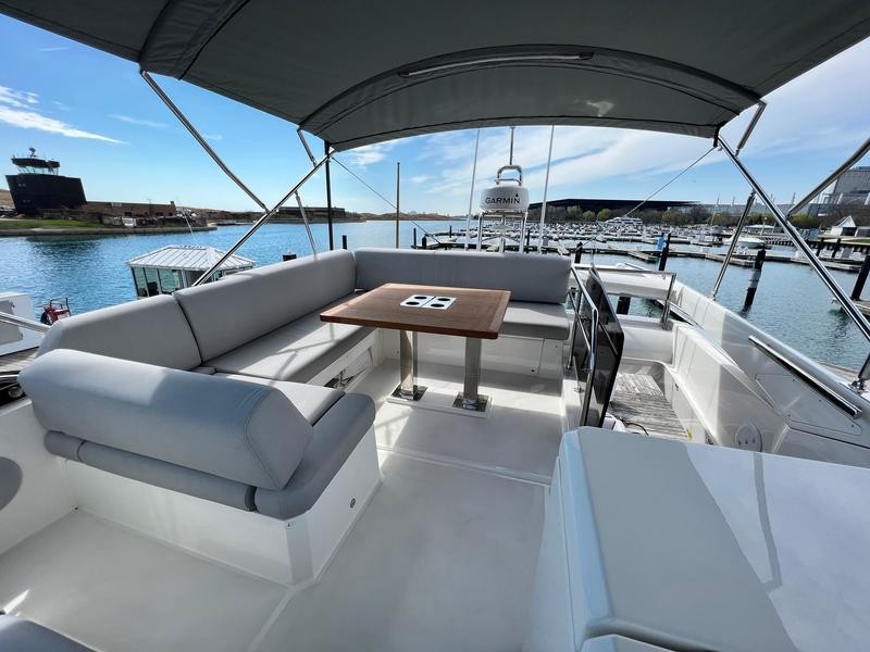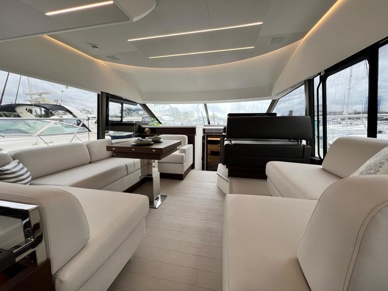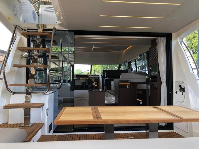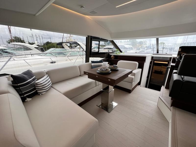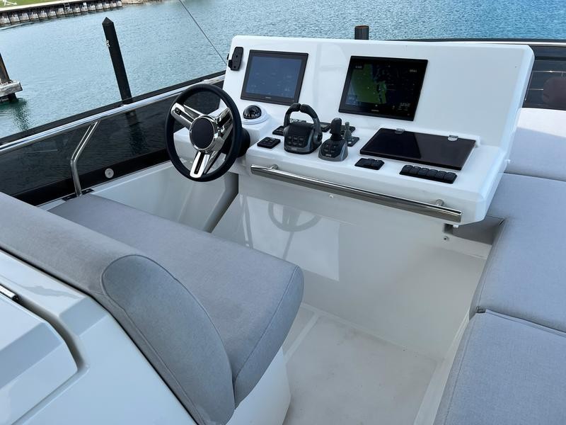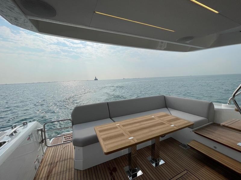 A pivoting cockpit bench seat offers flexibility to face forward toward sea view or rotate toward the salon for social gatherings. Inside, large panoramic windows flood the bright salon with natural light and provide plenty of comfortable seating and clever storage solutions.