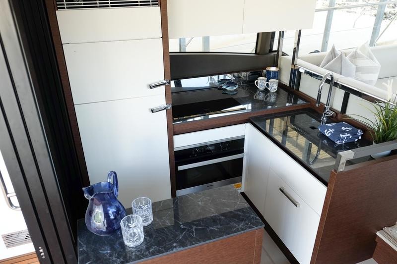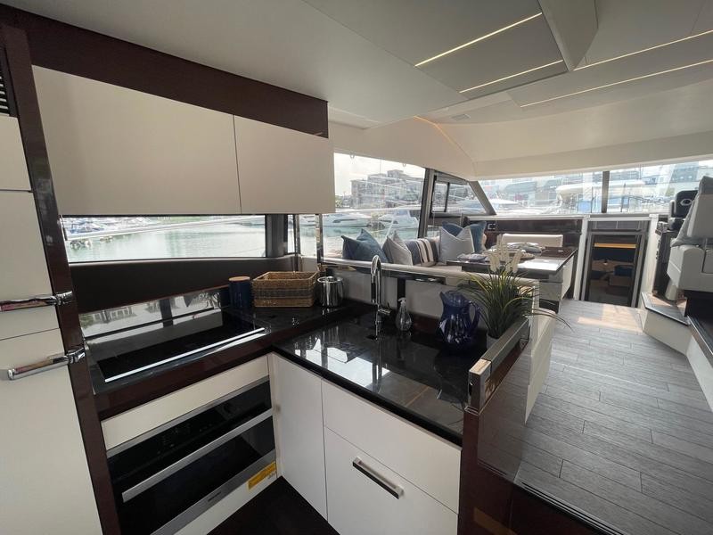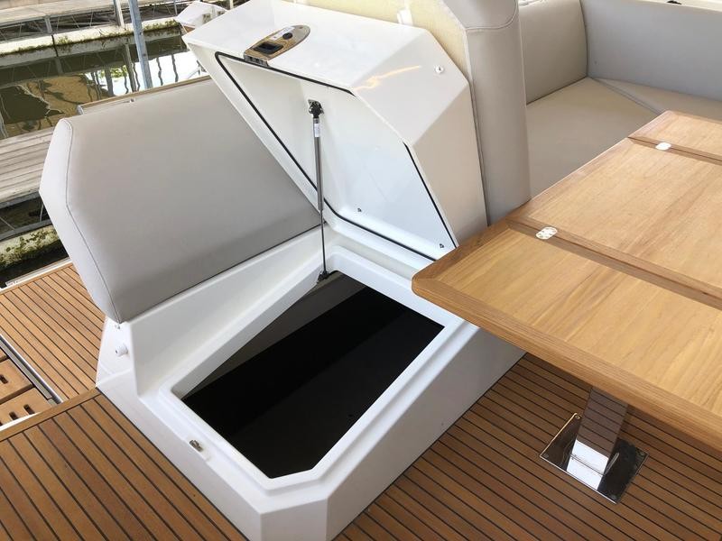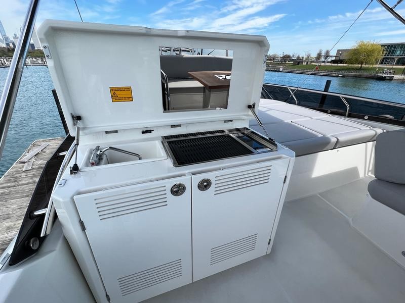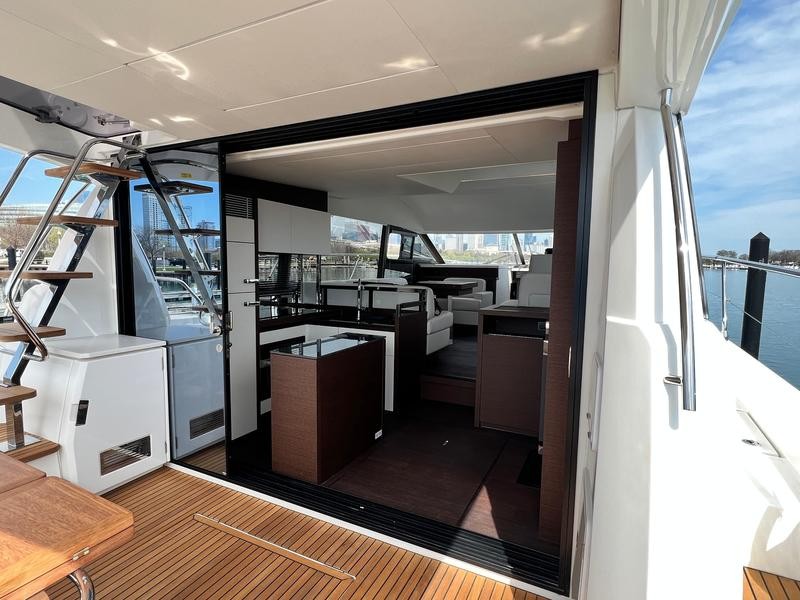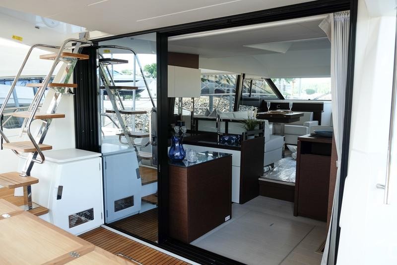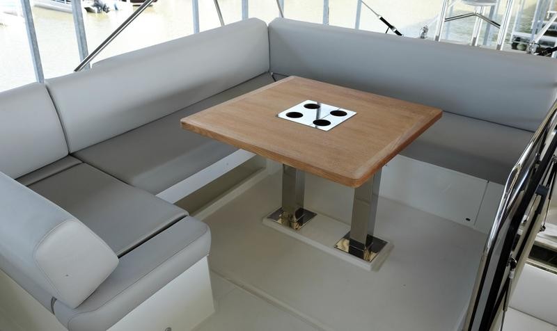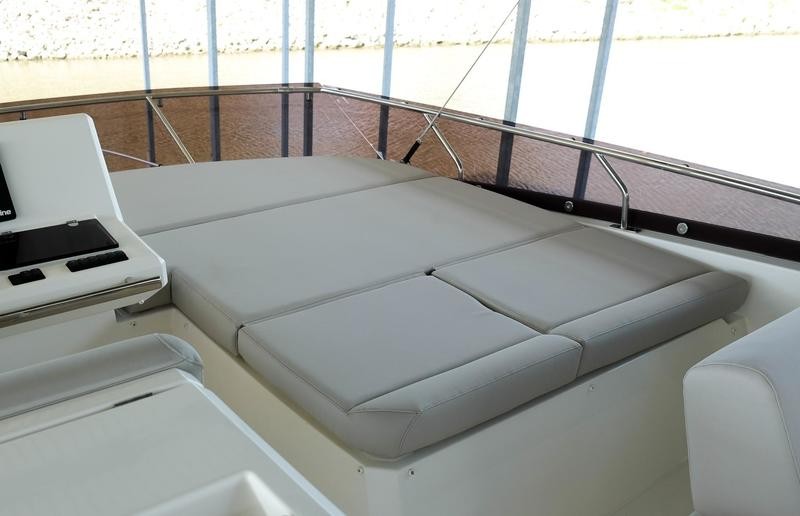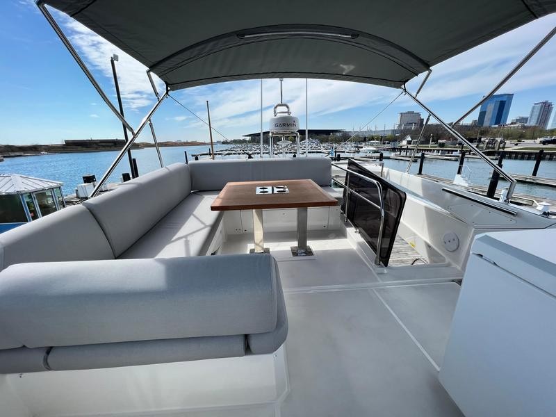 A pivoting cockpit bench seat offers flexibility to face forward toward sea view or rotate toward the salon for social gatherings. Inside, large panoramic windows flood the bright salon with natural light and provide plenty of comfortable seating and clever storage solutions.