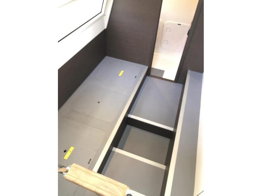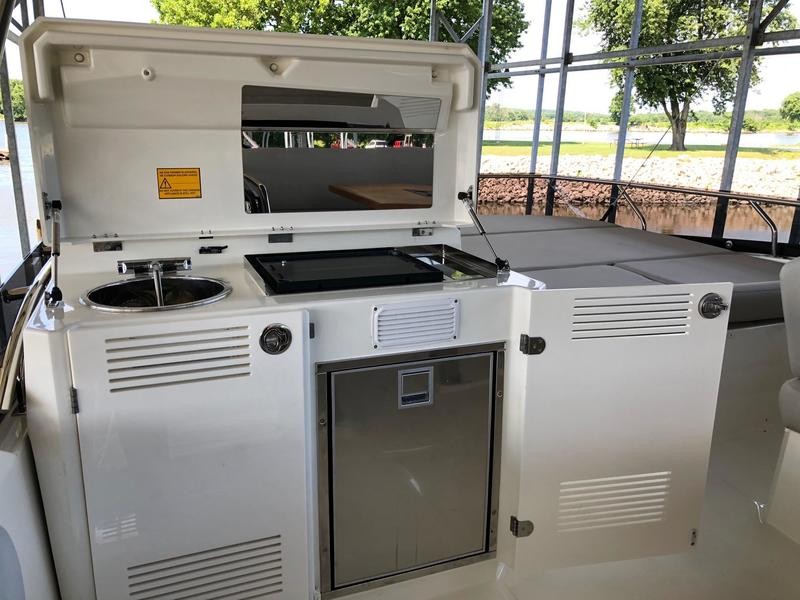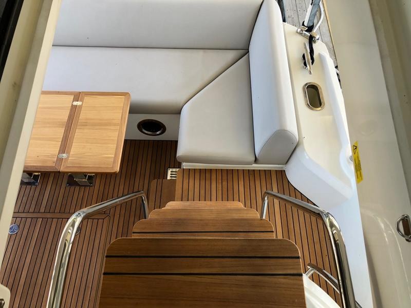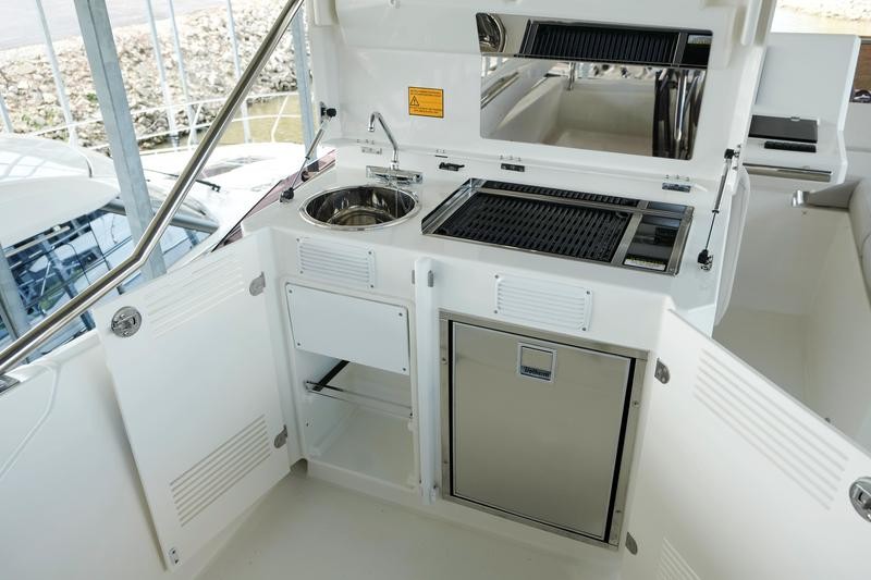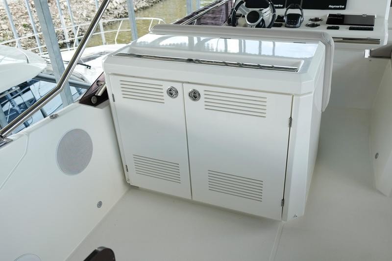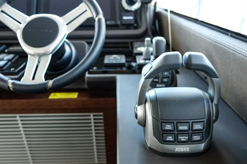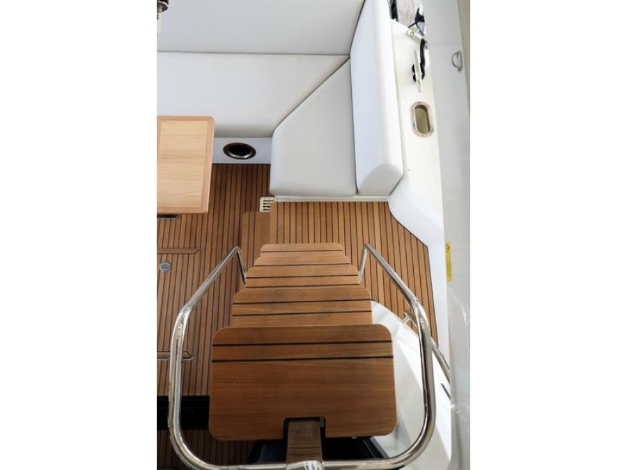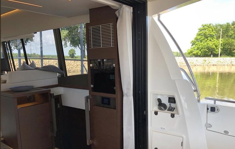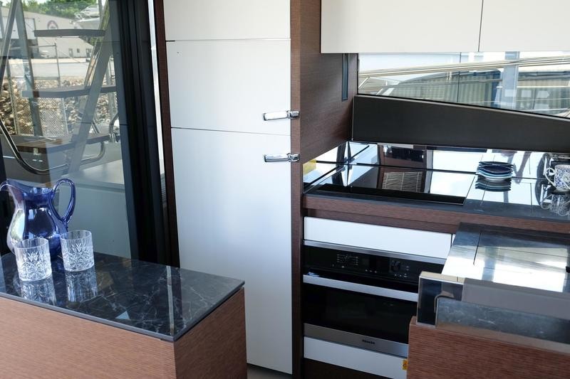 A pivoting cockpit bench seat offers flexibility to face forward toward sea view or rotate toward the salon for social gatherings. Inside, large panoramic windows flood the bright salon with natural light and provide plenty of comfortable seating and clever storage solutions.