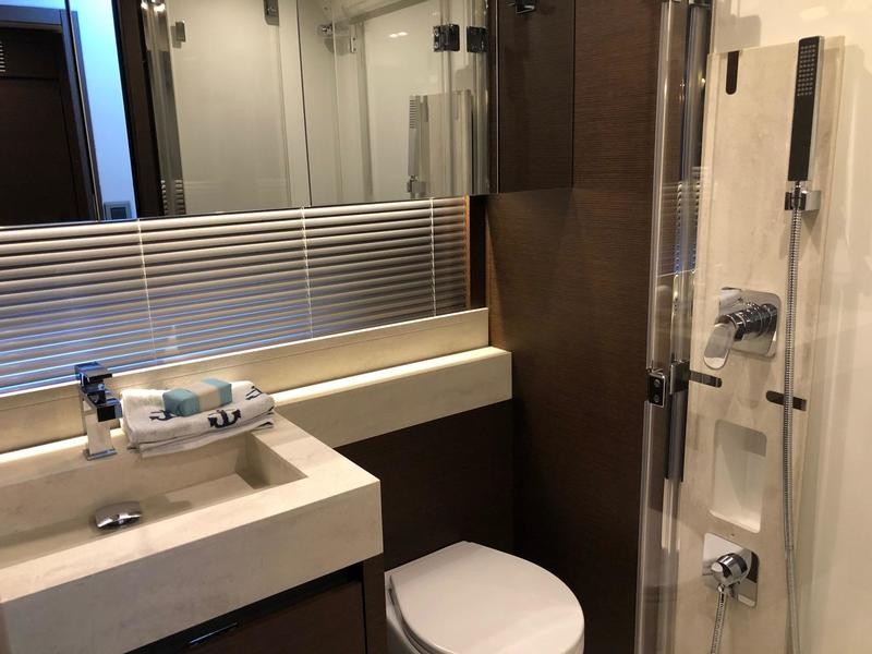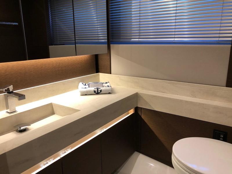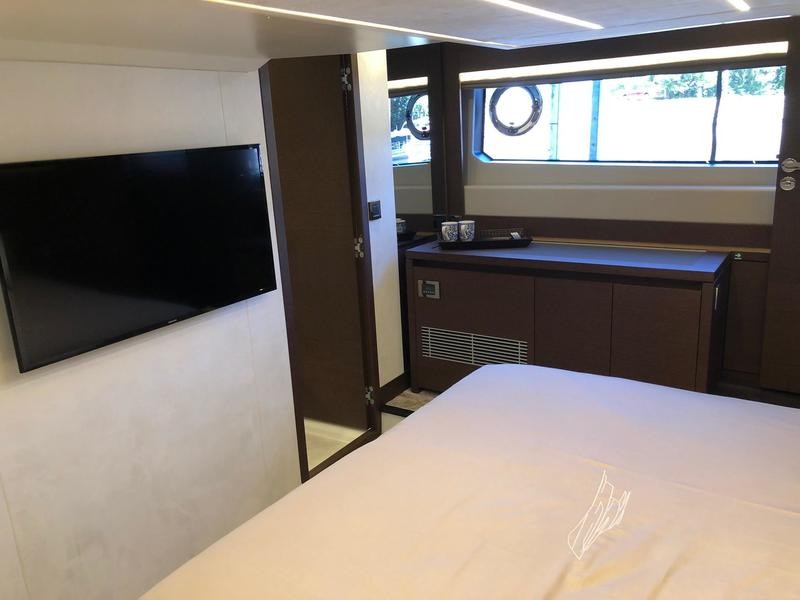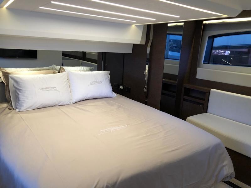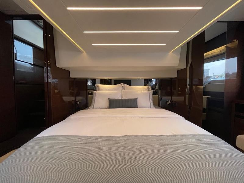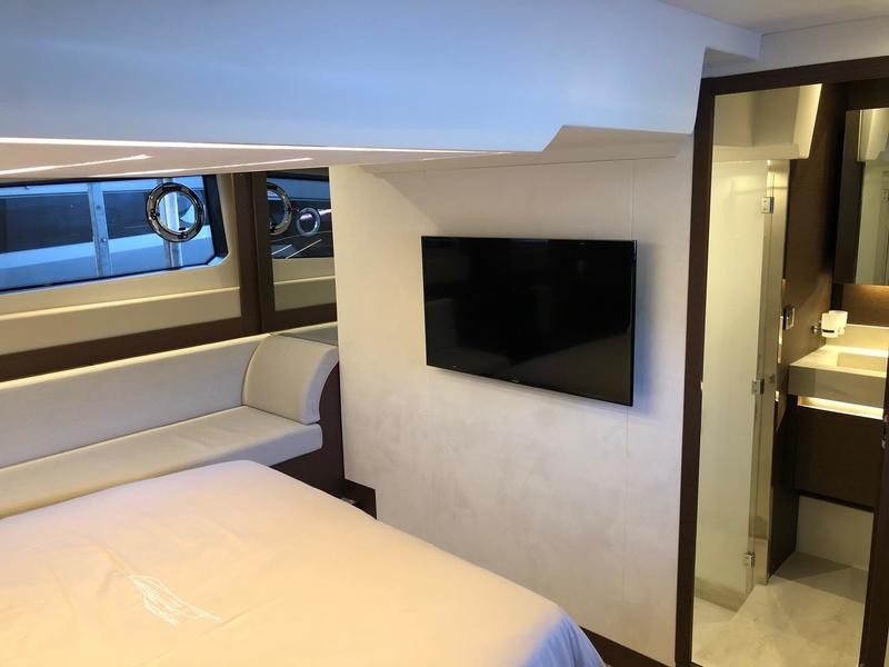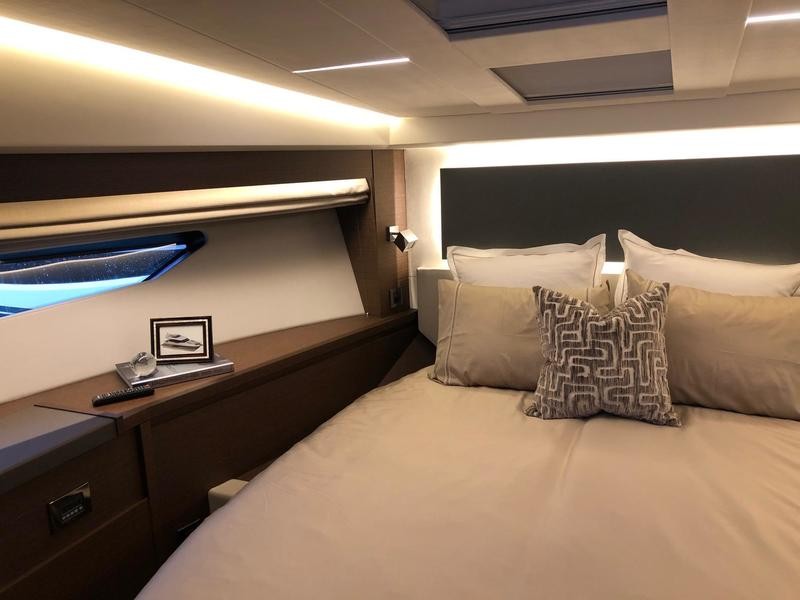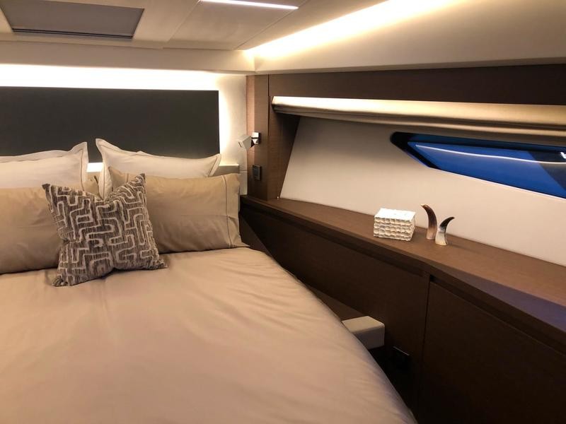 Beneath deck three well-appointed cabins await: a full‑beam owner’s suite featuring wide windows and an exclusive head; a forward VIP cabin; and an additional guest berth—perfect for weekend getaways or longer trips.
