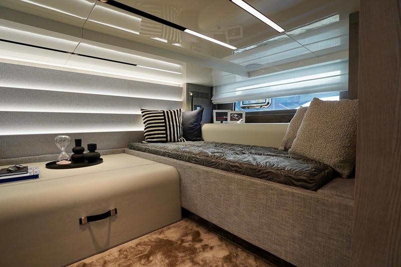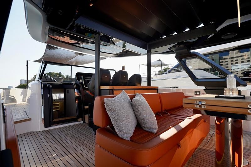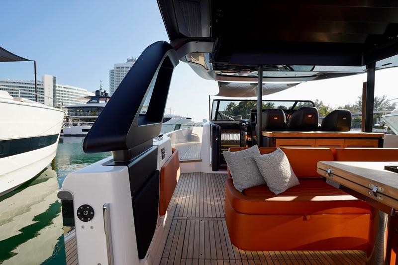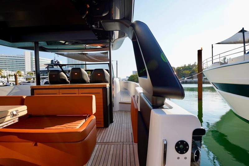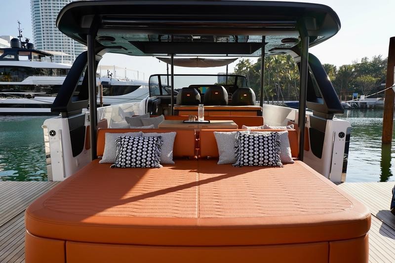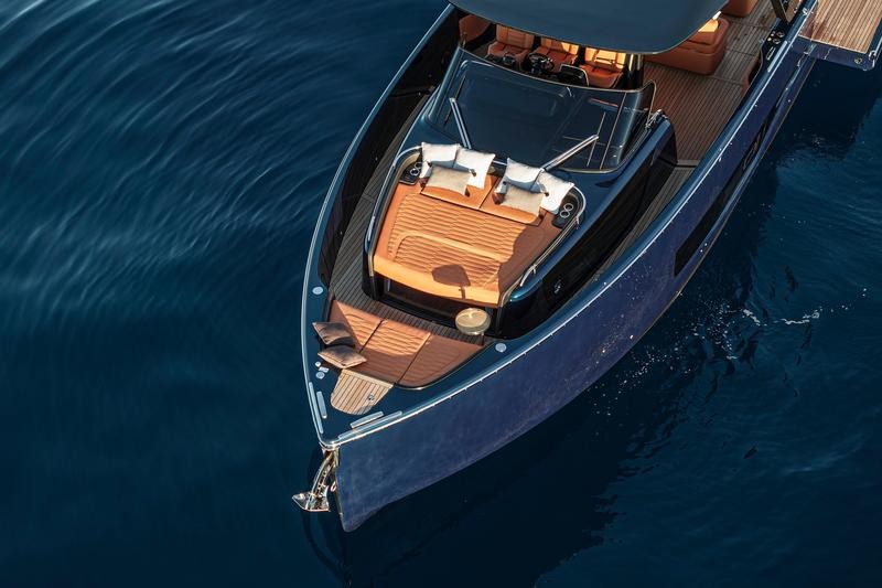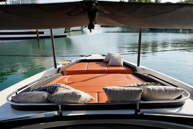 The ingenious fold-down sides further expand this social layout, making the space feel significantly larger than its footprint while maintaining constant connection to your surroundings and the deep blue of the lake. Forward, a sizable sunpad provides an ideal quiet zone for unwinding whether you are cruising or enjoying a day spent at rest.