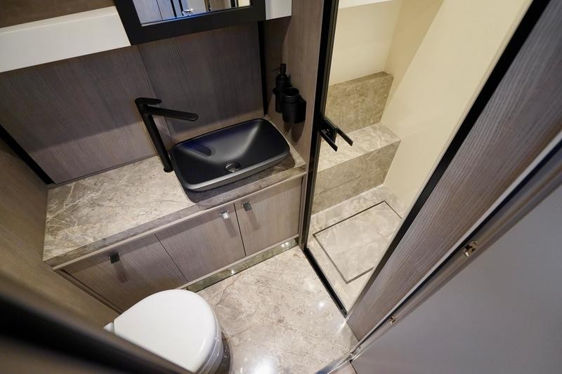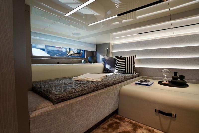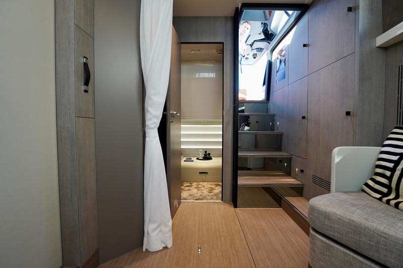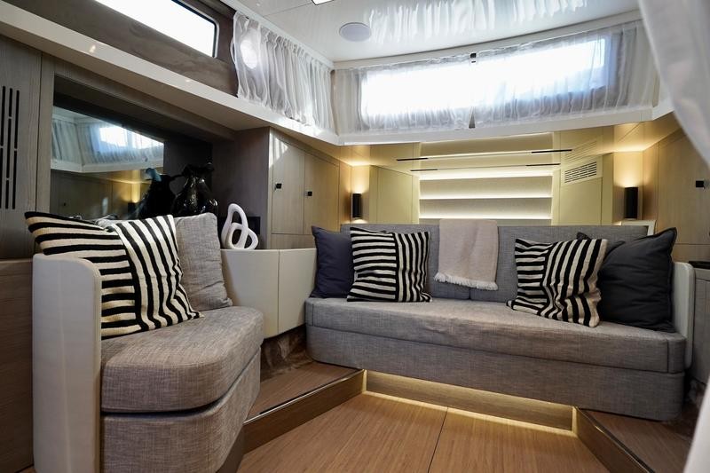 For those longer journeys requiring comfortable overnight stays, the A46 offers a thoughtfully designed and modern interior below deck. It comfortably accommodates up to four guests and includes a full head, ensuring maximum convenience without compromising style. The cabin maintains an atmosphere of ease; natural light streams through, complemented by warm finishes that create inviting spaces for relaxation.