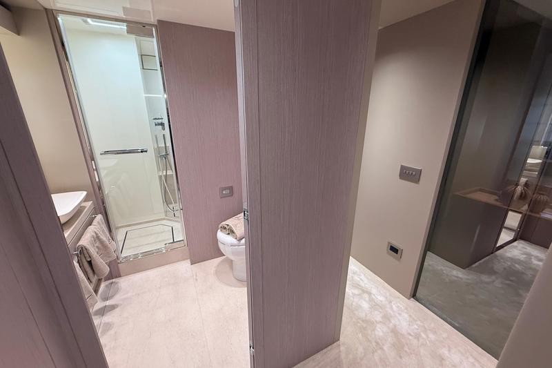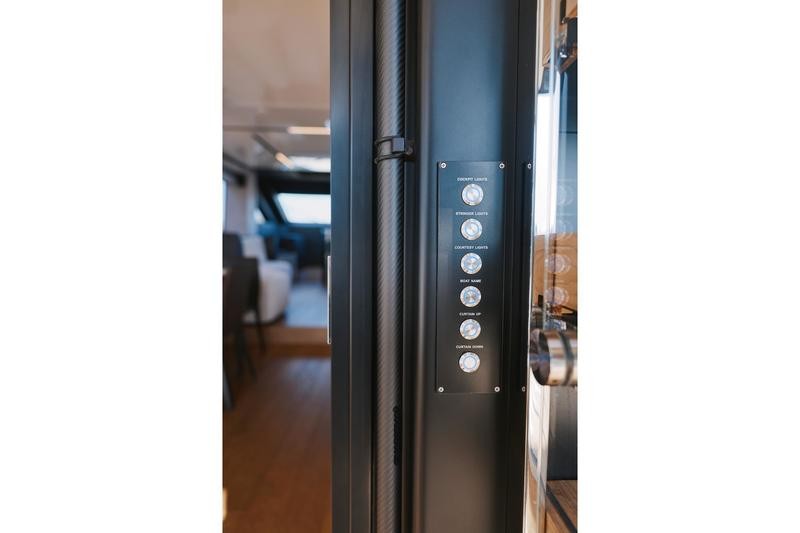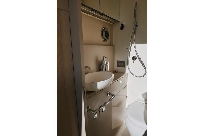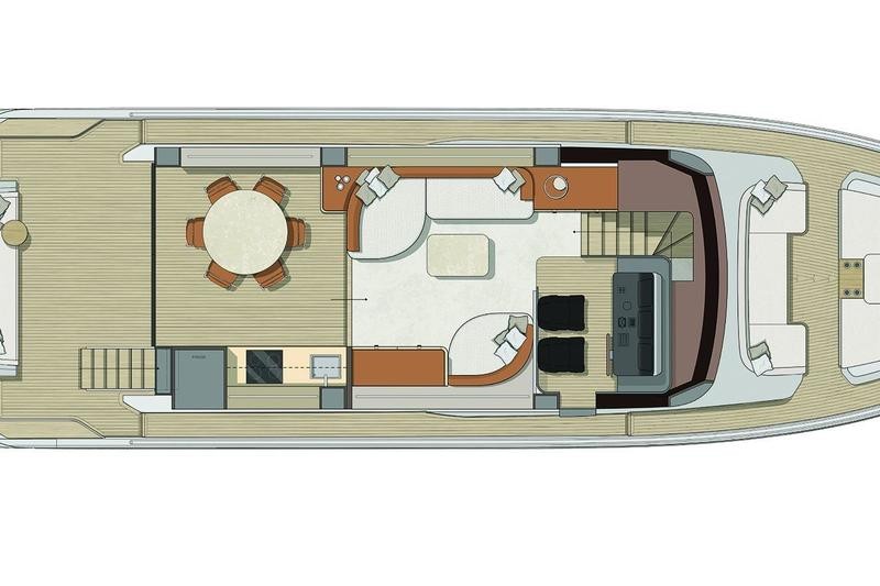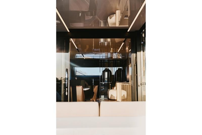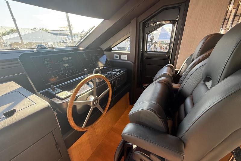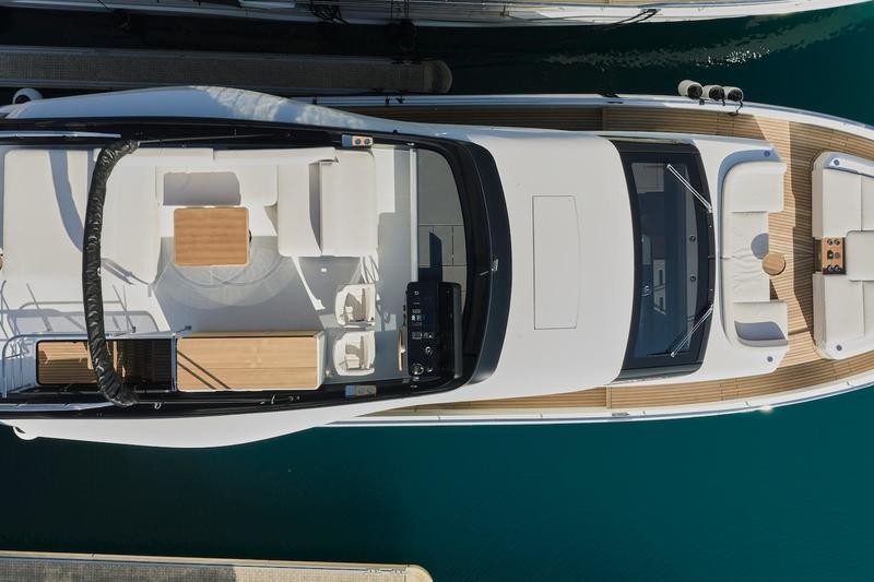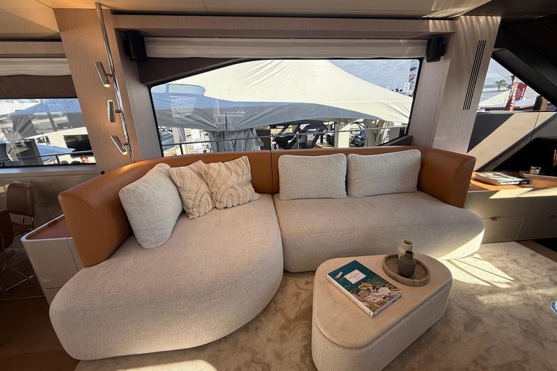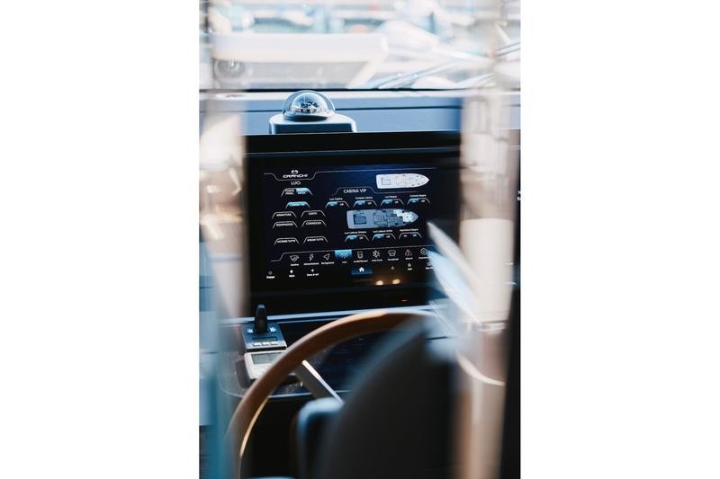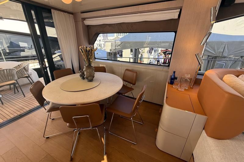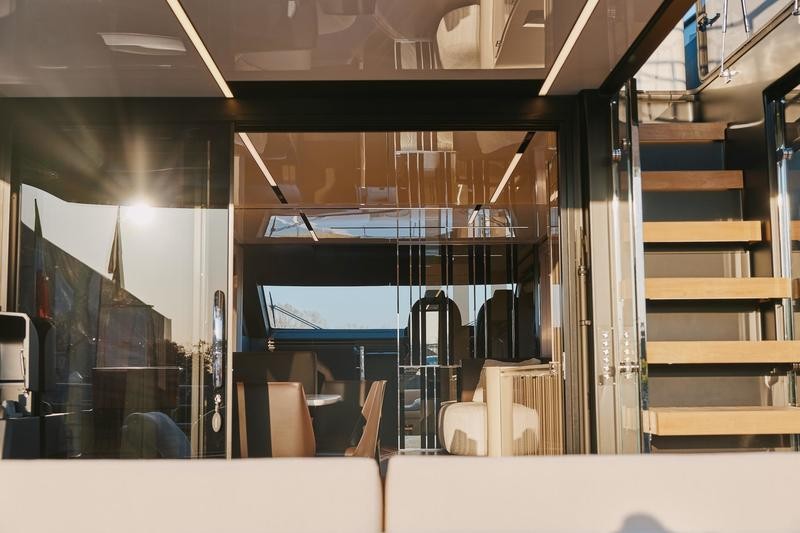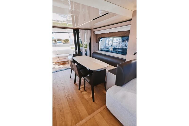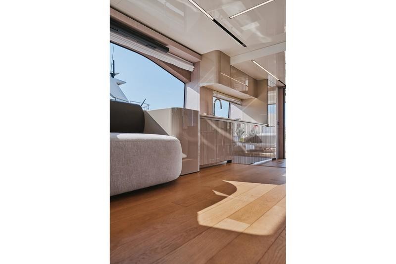 One of the most striking features aboard this magnificent cruiser is how the interior spaces flow together. The boundary between the main cockpit area and the spacious saloon virtually disappears. This effect is achieved through meticulous detailing: both the floor and ceiling areas flanking the double sliding glass door are finished in rich teak wood, giving the illusion that all zones merge into one vast, continuous veranda.