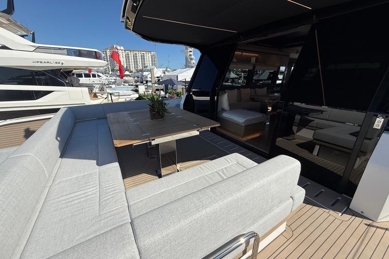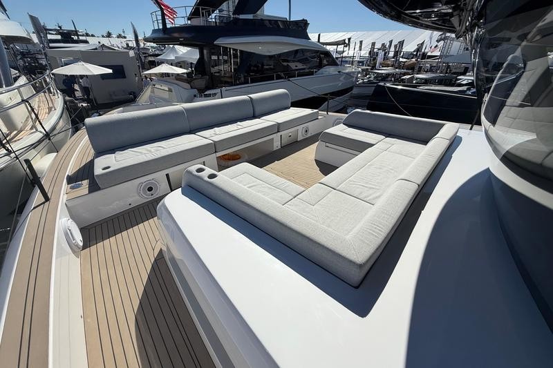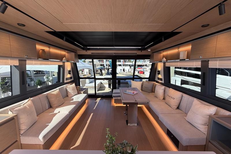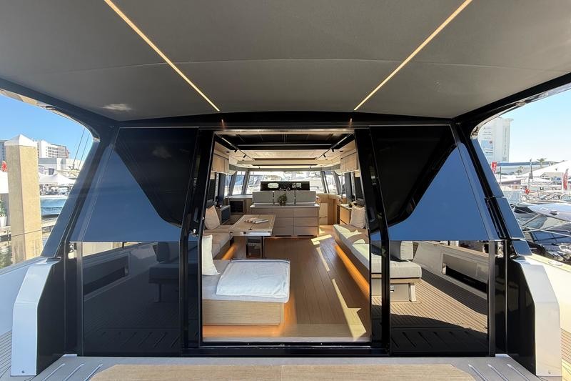 The GT75’s interior is bright, airy, and richly detailed. Fully opening aft doors merge the outdoor lounge with the salon, creating one seamless living space that feels like a modern seaside villa.