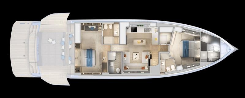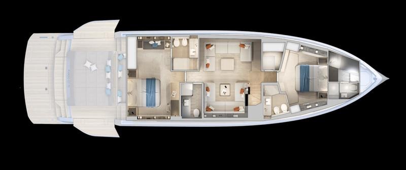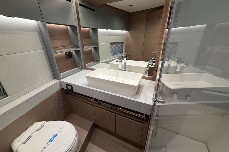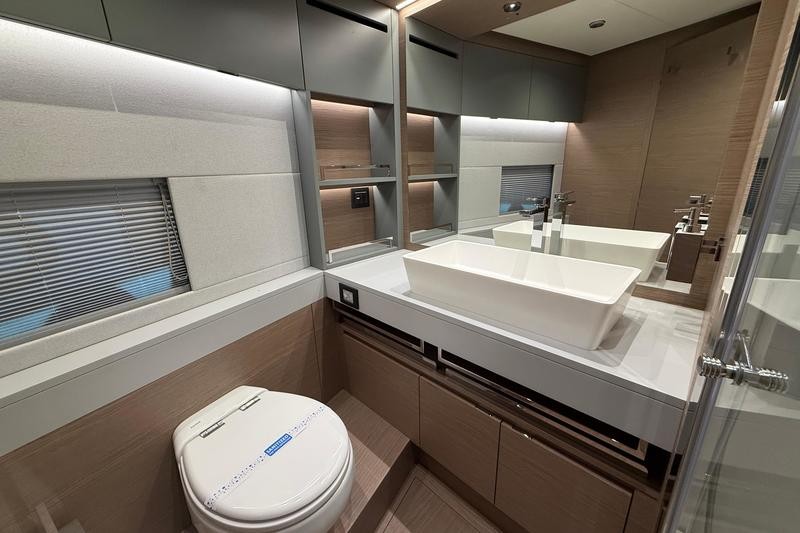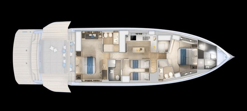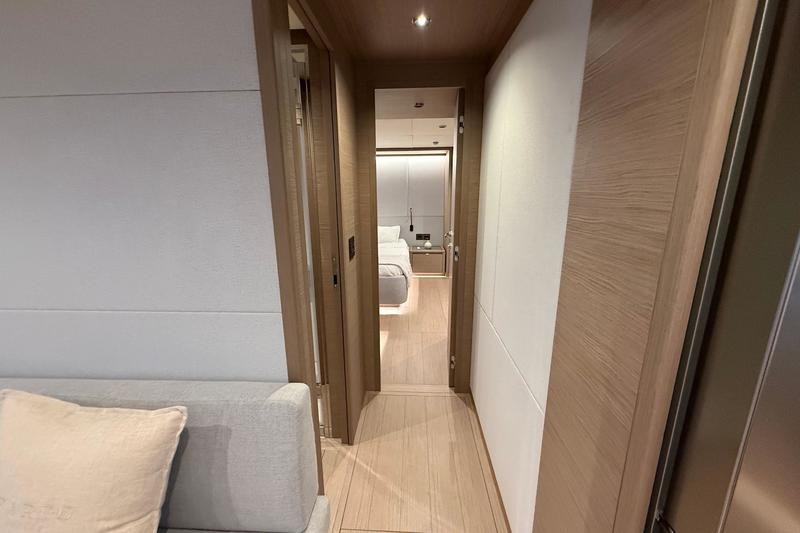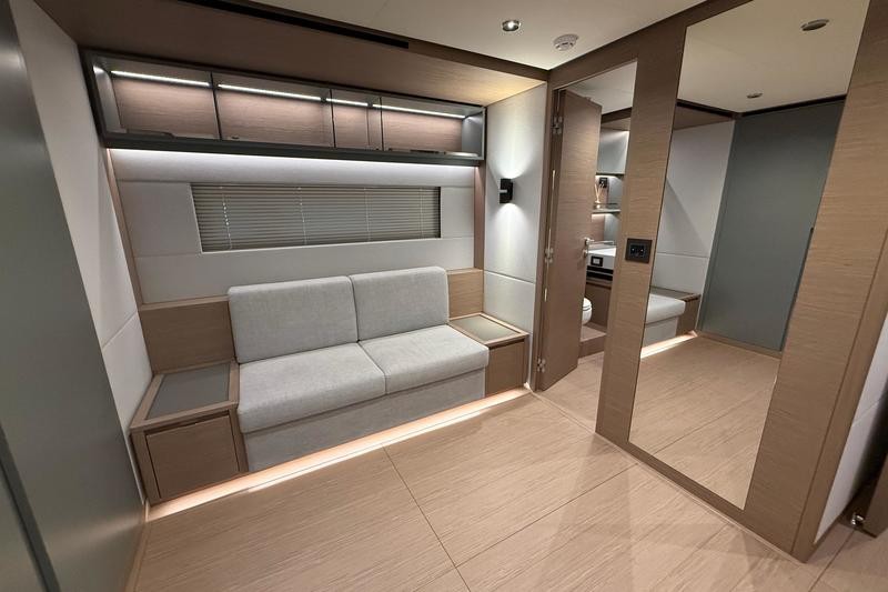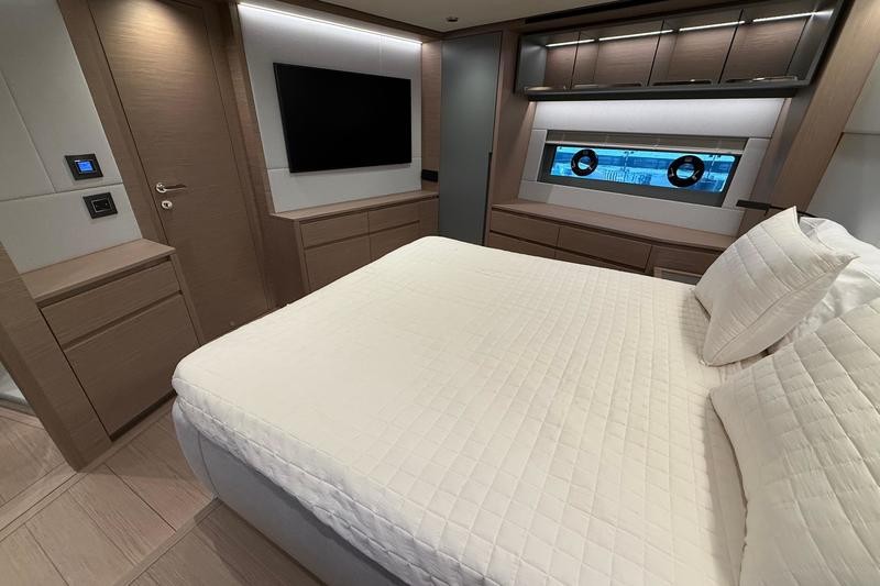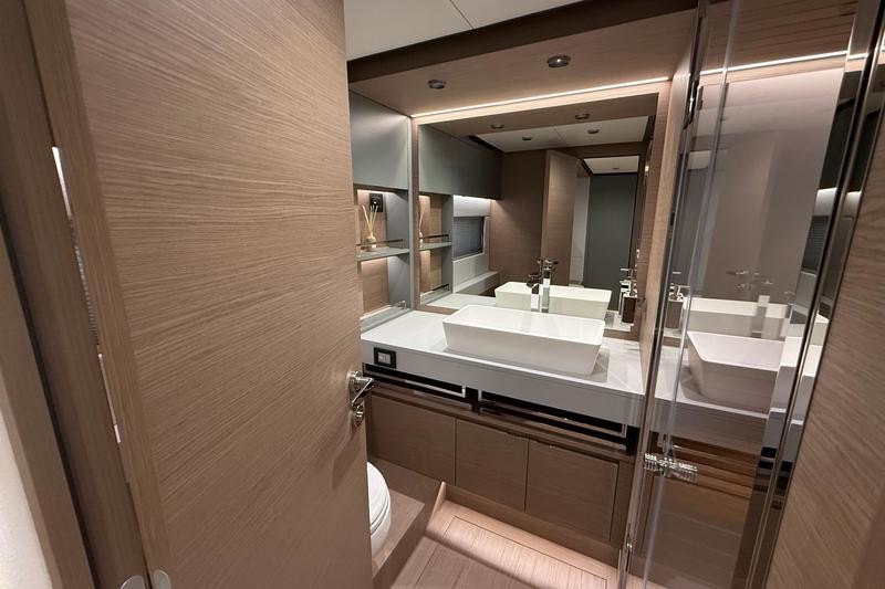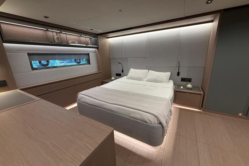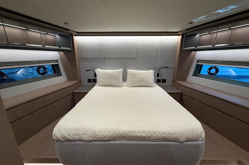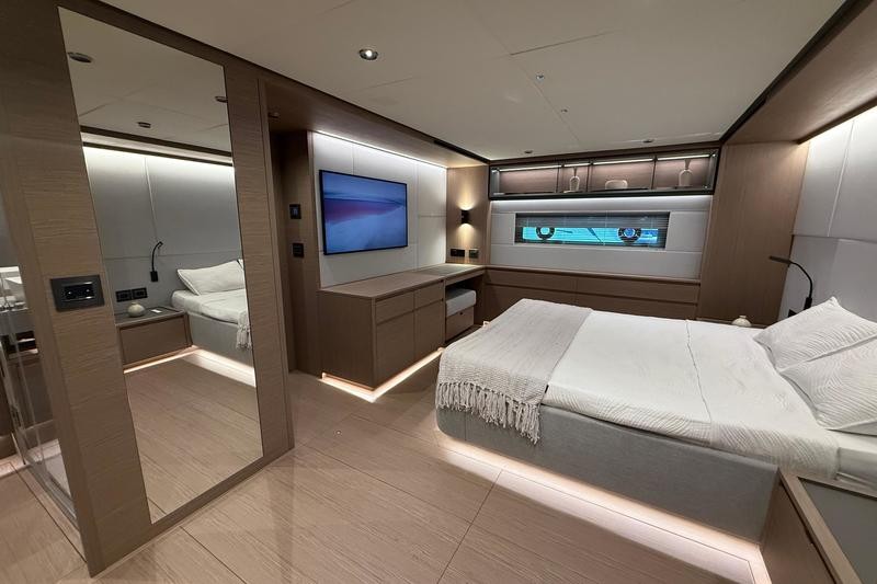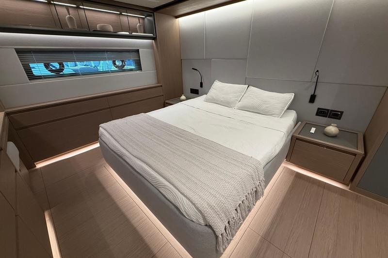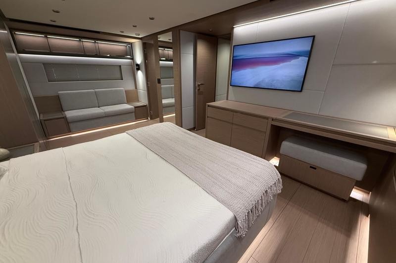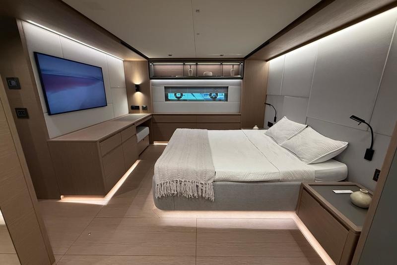 Up to four luxurious staterooms feature ensuite bathrooms, ample storage, and privacy. The full‑beam master suite boasts hull windows, a private sitting area, and spa‑inspired en‑suite for ultimate comfort at sea.