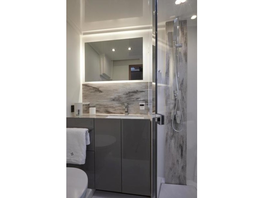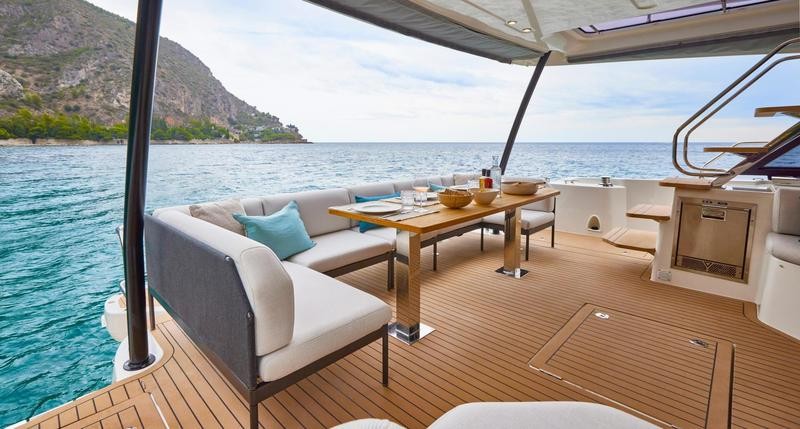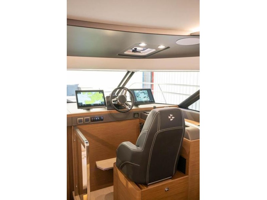 The wide beam of the M48 creates generous walkways and gathering areas throughout the vessel. At the stern a large cockpit opens directly onto a swim platform – ideal for swimming, relaxing or launching water toys. Sliding doors lead to an airy salon that flows seamlessly from inside to outside. The bow lounge offers quiet relaxation with panoramic views, while the flybridge provides elevated seating, a helm station and ample space for socializing under open sky.
