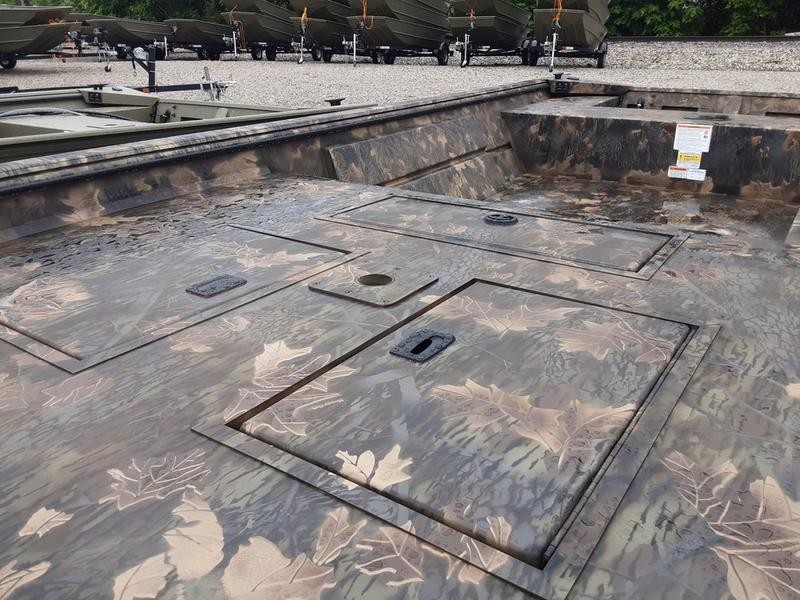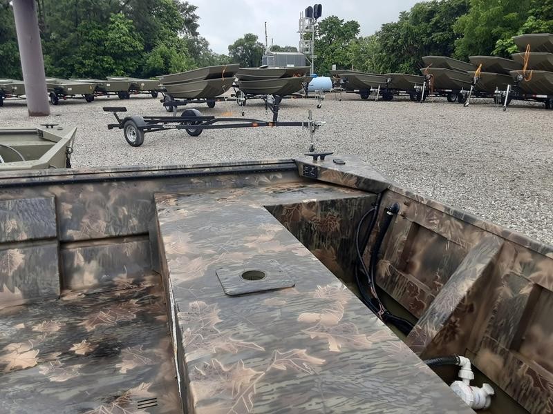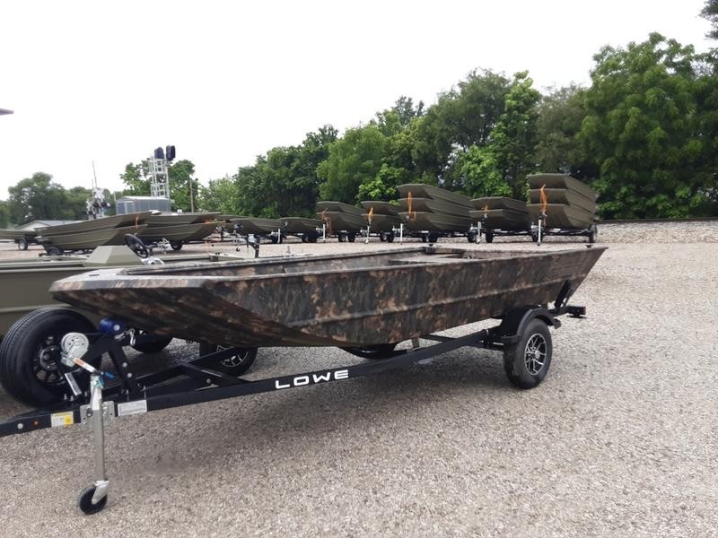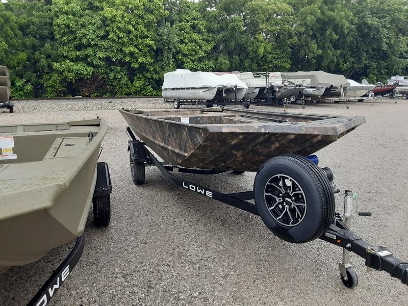 The 2024 Lowe Roughneck 1660 is a lightweight aluminum fishing boat designed for multi‑species angling and easy trailering. Finished in Mossy Oak Break Up camouflage, it sits on a Karavan trailer with swing tongue for convenient transport.