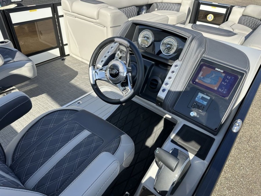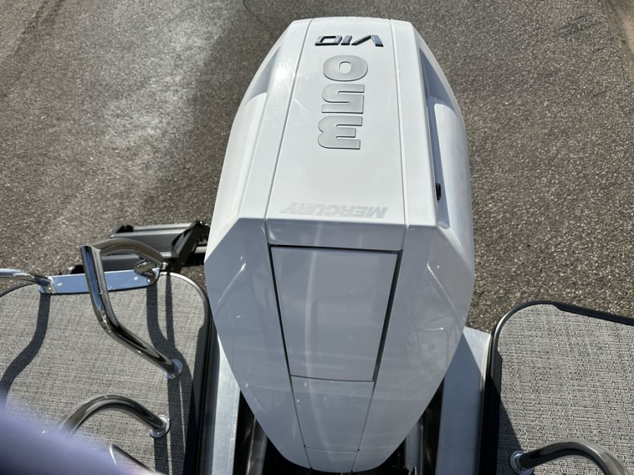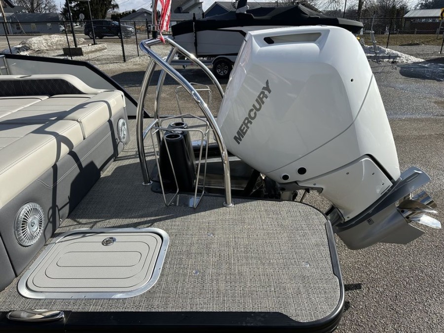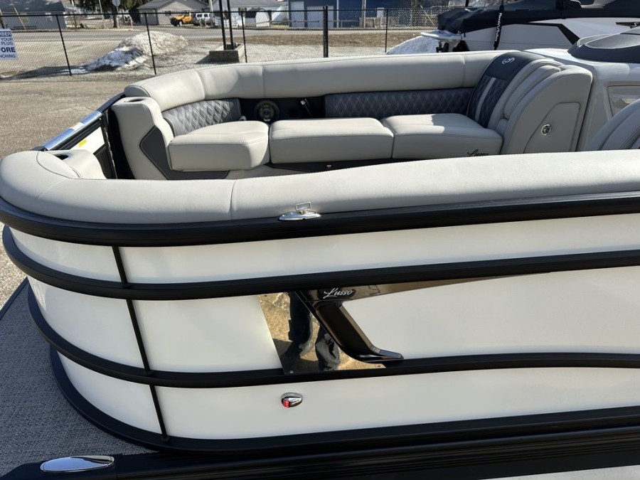 This specific new Lusso model represents top-tier performance and comfort. It is equipped with a powerful Mercury outboard engine, providing reliable propulsion for all your adventures across Indiana waters. The durable triple tube hull construction ensures stability whether you are cruising near Simonton Lake or heading out on open water.