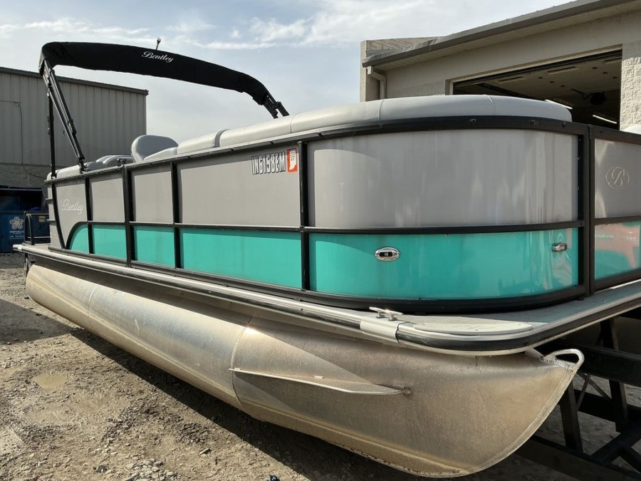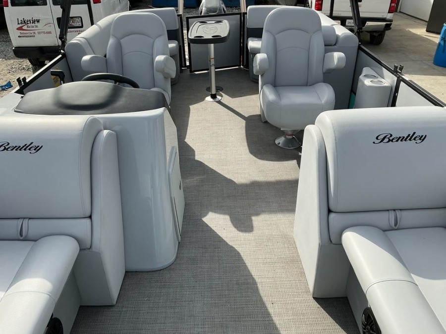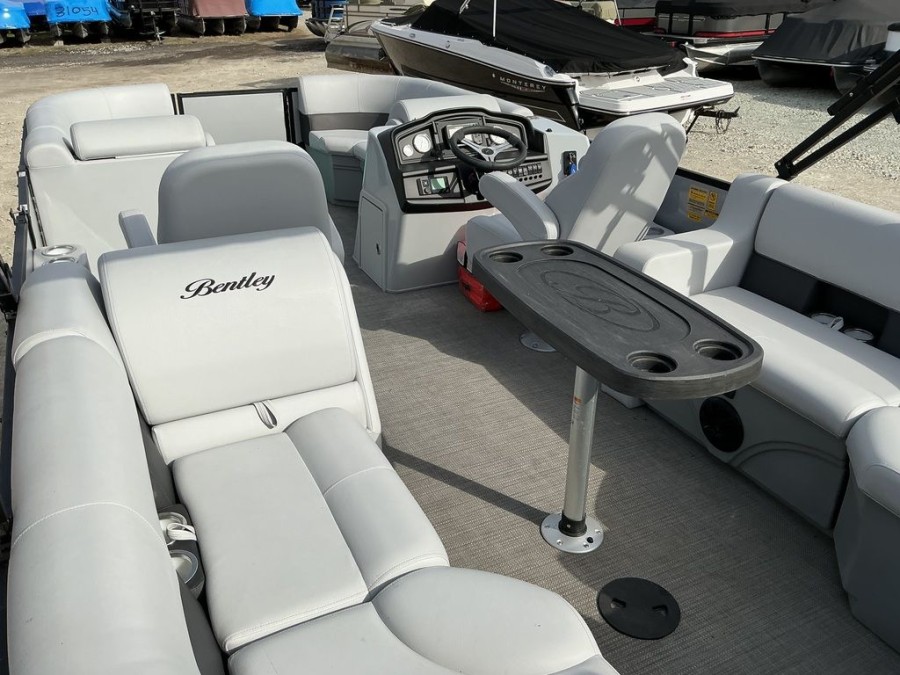 | Crew Comfort | Bentley premium radius wide‑step aluminum ladder, standard midback helm seat, and a 10′ quick‑disconnect bimini top to keep guests shaded. |