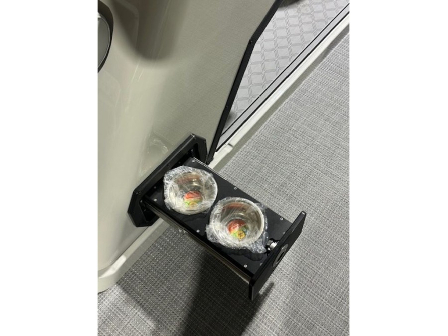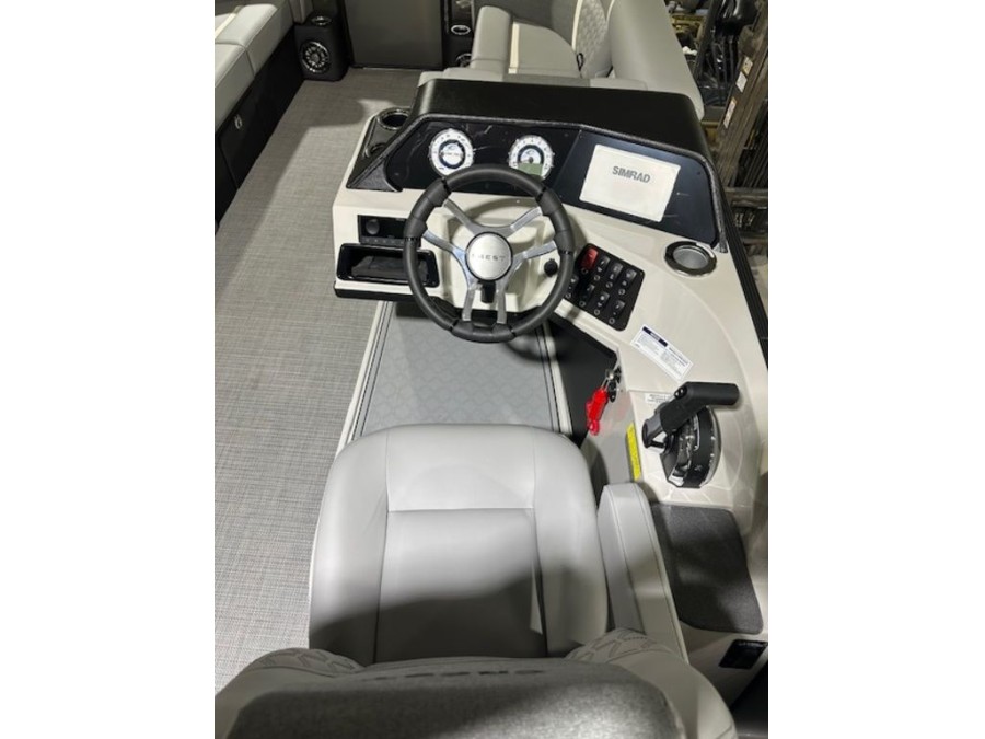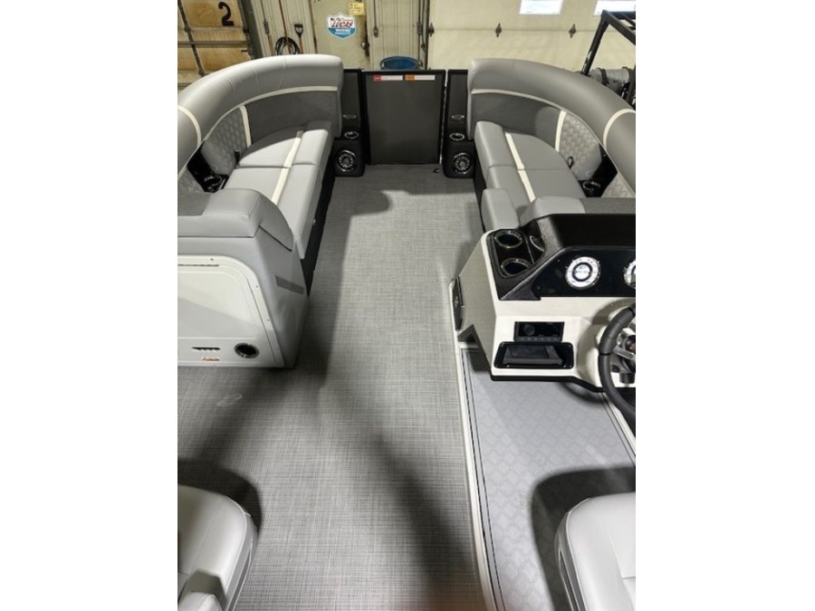 This impressive new pontoon boat comes loaded with amenities, ensuring every outing is memorable. Designed for maximum enjoyment on the water, key upgrades include a complete Audio Package perfect for setting the mood while cruising. For added convenience and luxury, it features two dedicated helm chairs providing comfortable seating for multiple passengers.